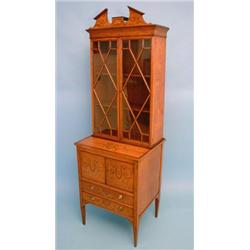 A Sheraton revival satinwood display cabinet, marquetry inlaid and having broken architectural pediment and a pair of astragal-glazed doors over cupboard and 2 long drawers, on tapered legs, (the 2 sections associated), 1ft 11ins. 1000-1500