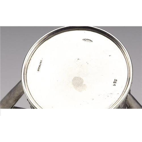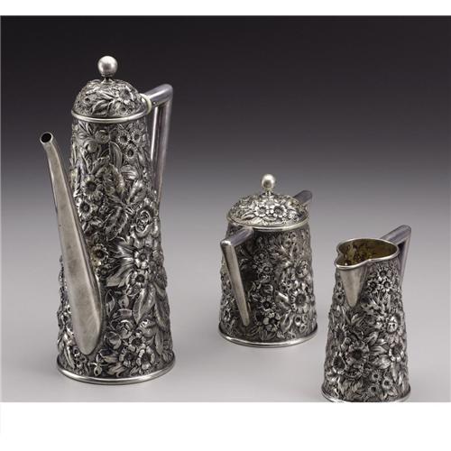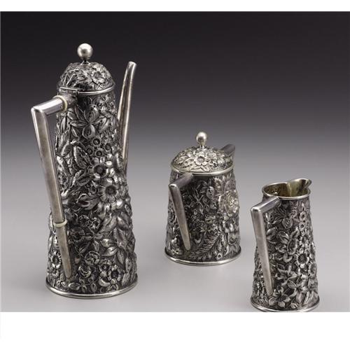 <B>An American Three Piece Tea Set</B></I><BR><BR>George W. Shiebler, New York, New York<BR>Circa 1870-1915<BR>Silver and ivory<BR>Marks: all with the hallmark of (Shiebler), <I>Sterling / 256</B></I><BR>8.12 in. high (teapot), 23.42 Troy ounces<BR><BR>Comprising a teapot, open creamer and covered sugar, all with repousse bodies of flaring cylindrical form, angular handles and ball finials <BR><BR><B>Important notice:</