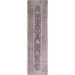 A Shirvan Caucasian runner, the dark blue field with pairs of peacocks and flowering plants, within mid blue vine border and multiple guard stripes, 13ft 5ins by 3ft 8ins. £1,200-1,600