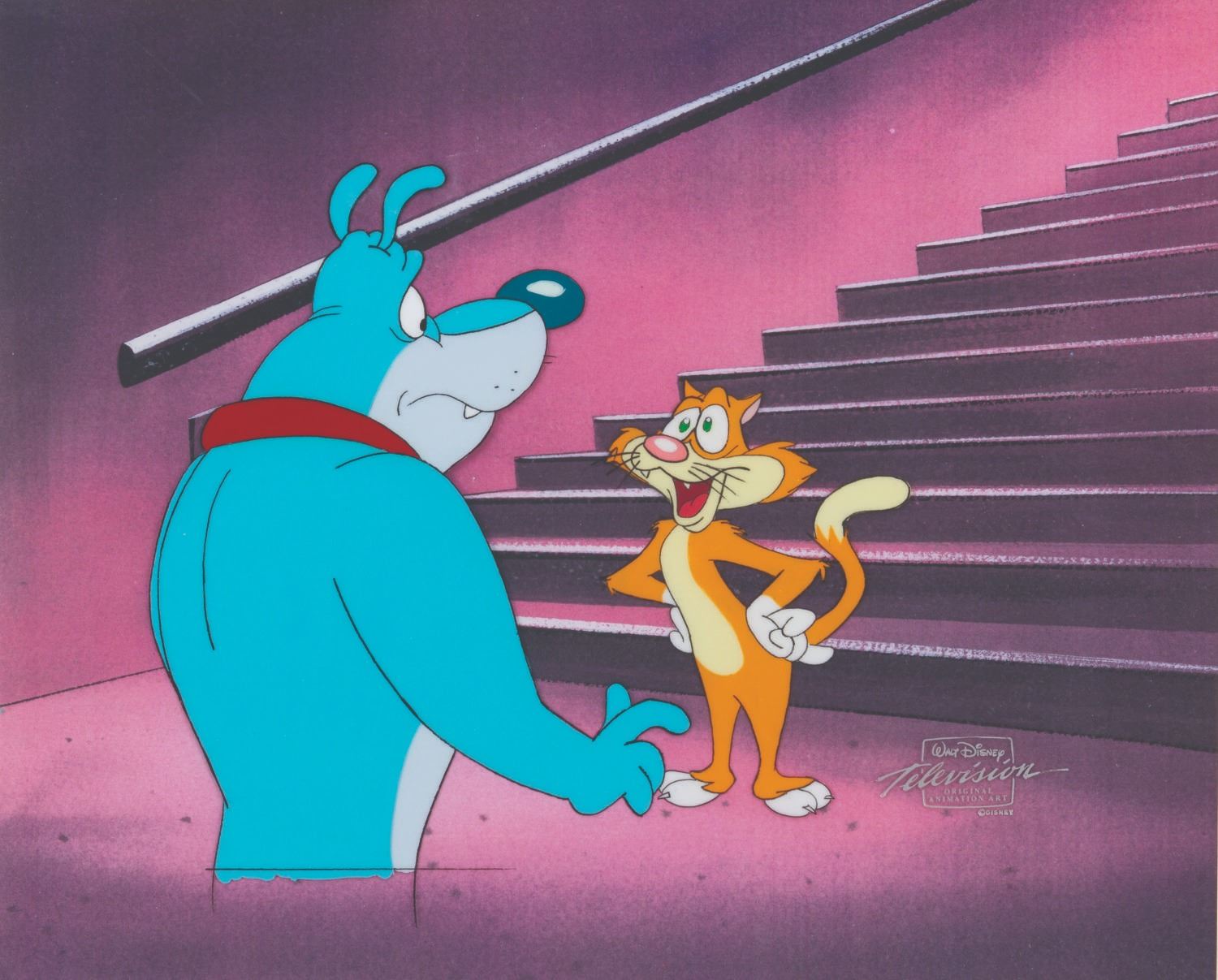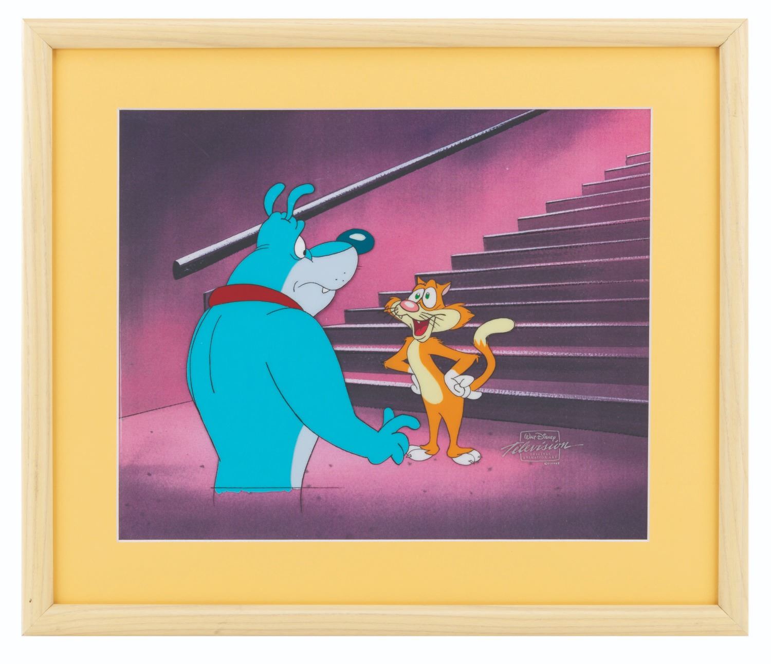 (Disney, 1995) An original hand-painted production cel of the lead characters from “The Shnookums & Meat Funny Cartoon Show.” In response to edgier cartoons including “Rocko’s Modern Life” and “The Ren & Stimpy Show,” Disney spun these characters off from “Marsupilami” into their own series. Shnookums and Meat have an image size of 7” x 7.5” on a 10” x 12” visible cel. The art is in very good condition with light scratches.