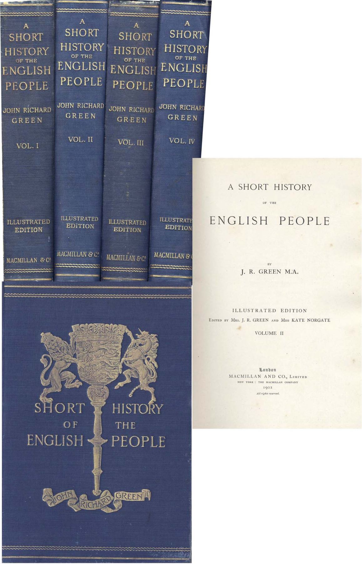 ''A Short History of the English People'' by John Richard Green. London: MacMillan and Co., 1902. In four volumes, this is the special illustrated reissue of the original 1892 publication. Each volume, measuring 7'' x 10'', averages 470pp. and contains color frontispiece with tissue overlay. Topics include ''England Under Foreign Rule'', ''The Three Edwards'' and ''Puritan England''. Royal blue cloth boards are nicely embellished with gilt design and font. Spine of volume I is starting to separate, and all books have foxing and some pencil notes, though not affecting bright interior. Very good.