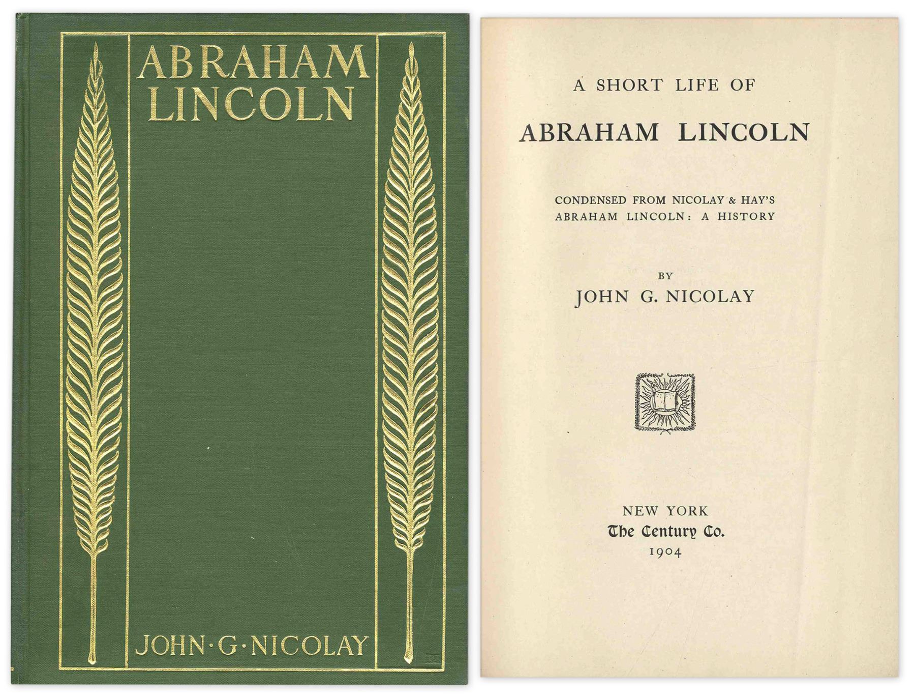 ''A Short Life of Abraham Lincoln. Condensed from Nicolay and Hay's 'Abraham Lincoln: A History''' by John G. Nicolay. New York: The Century Company: 1904. Frontispiece with tissue overlay is that of ''President Lincoln and His Son 'Tad'''. Contents cover Lincoln's childhood, his early legal career, presidential administration, Civil War and assassination. Previous owner's name and date on the front free end paper. Binding is a little loose; overall very good condition with boards in fine condition.