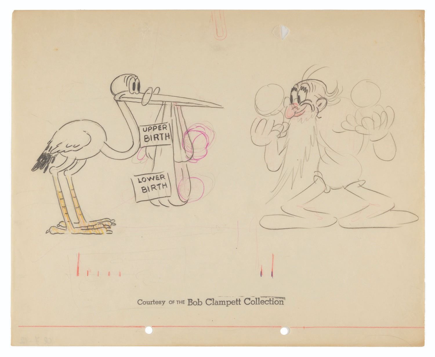 (Harman-Ising, 1933) An original production drawing from the Merrie Melodies short “Shuffle Off to Buffalo.” With an image size of 5.5” x 11.25” on 9.75” x 12” animation paper, the graphite and colored pencil drawing is in good condition, stamped “Courtesy of the Bob Clampett Collection,” with light creases, edge wear, discoloration from age, pinholes, and a 0.5” tear.