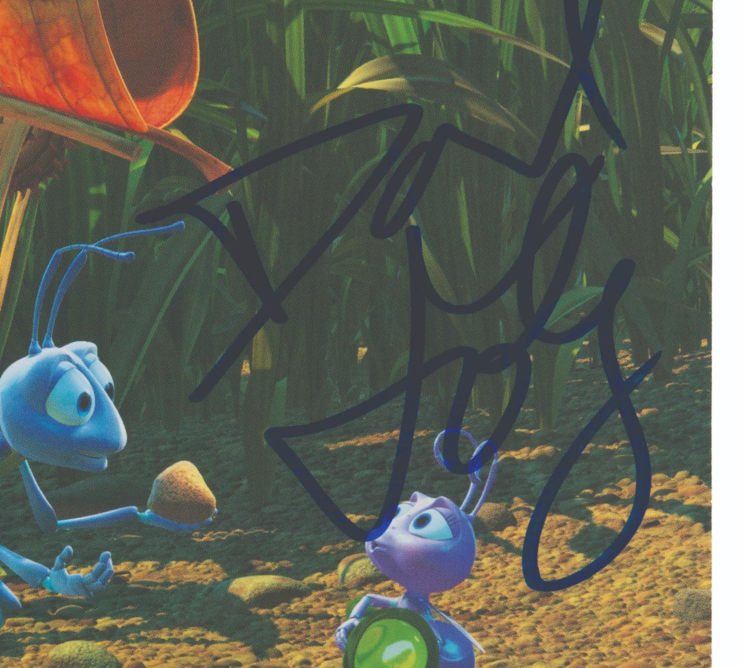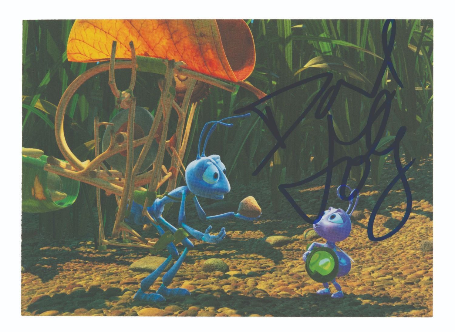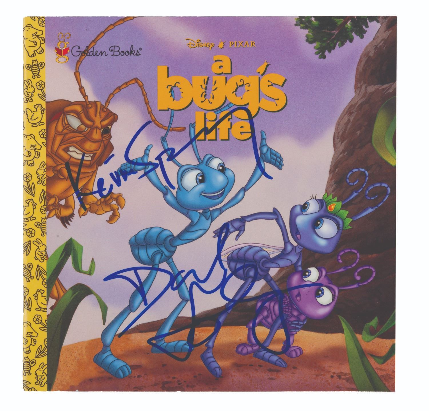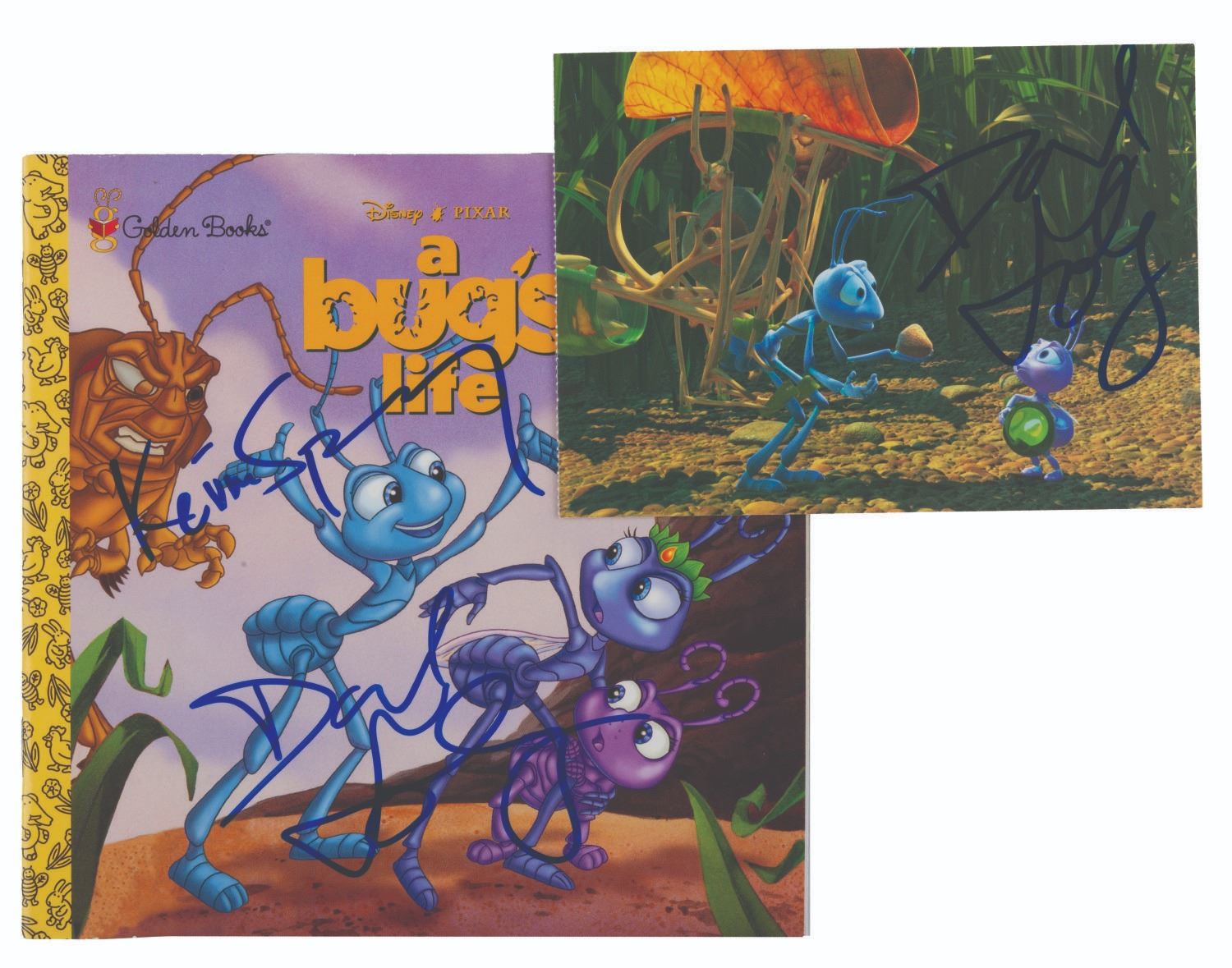 (Disney, 1998) “A Bug’s Life” Golden Book and postcard signed by Kevin Spacey (Hopper) and David Foley (Flik). Measuring 4.75” x 6.75” and 8” x 8”, the postcard and book are in fine condition.