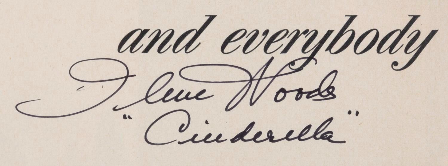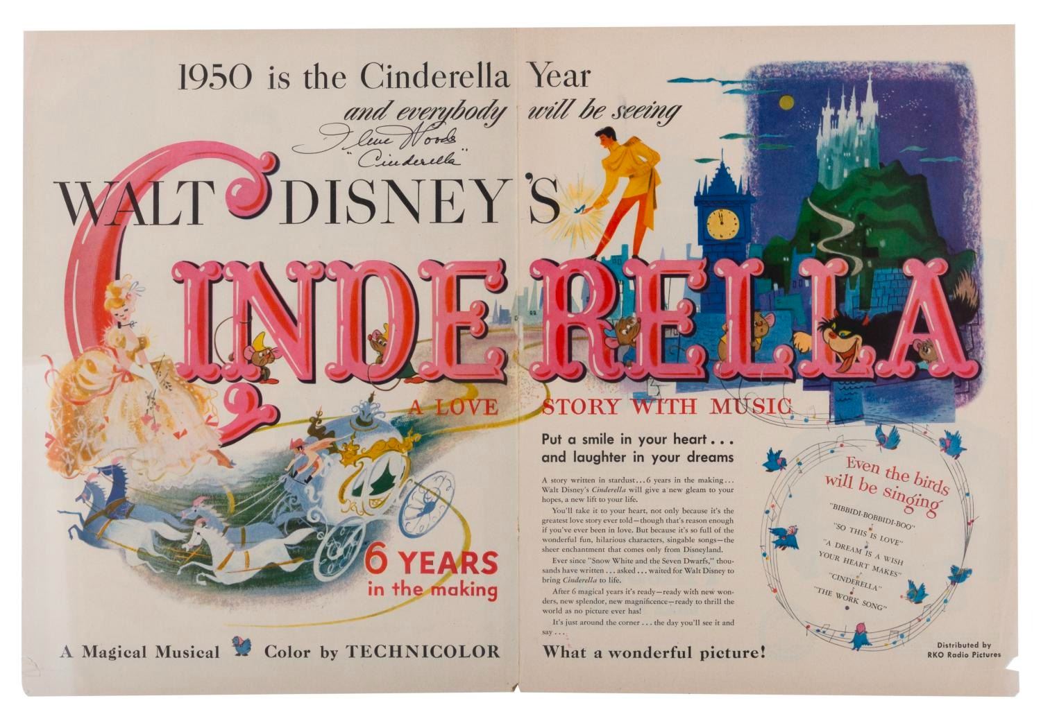 (Disney, 1958) A two-page magazine spread for Walt Disney's"Cinderella" signed by Ilene Woods, the voice of Cinderella. Measuring 13.5" x 20.5", the spread is in good condition with tears in the lower corners, light discoloration, edge wear, and creasing.