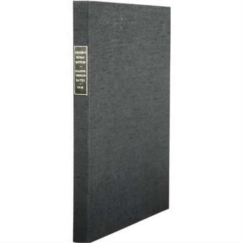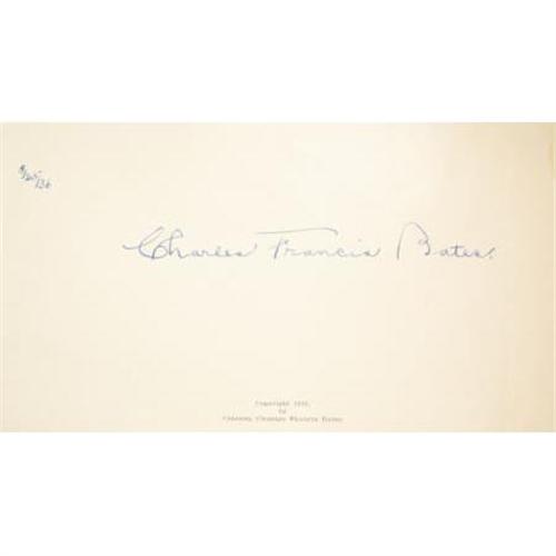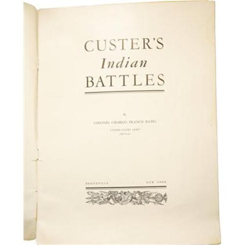 <B>General George Armstrong Custer: A Signed Copy of <I>Custer's Indian Battles </B></I></B></I><B>by Colonel Charles Francis Bates, United States Army (retired). </B></I>(Bronxville, New York: Privately printed by the author, 1936 ). First edition. Signed by the author on the first page and dated by him 8/25/36. Quarto (9” x 12”). 36 pp. Illustrated with photographs, including a large official portrait of Custer, and with a frontispiece map of the Little Bighorn. In the original printed and illustrated wrappers, with a drawing of Custer on horseback and with sword drawn from a sketch by James E. Kelly. Wrappers a bit soiled and chipped, with small pieces missing from the bottom corners of the front wrapper. Small and faint stain to the fore-edge margin, well away from any text or pictures. Altogether, an attractive copy in very good condition, housed in a custom clamshell of black cloth with a black morocco lettering label stamped in gilt on the spine.<BR><BR><b>Shipping:</b> Books & Catalogs (<a target="_blank" href="http://www.heritageauctions.com/common/shipping.php">view shipping information</a>)