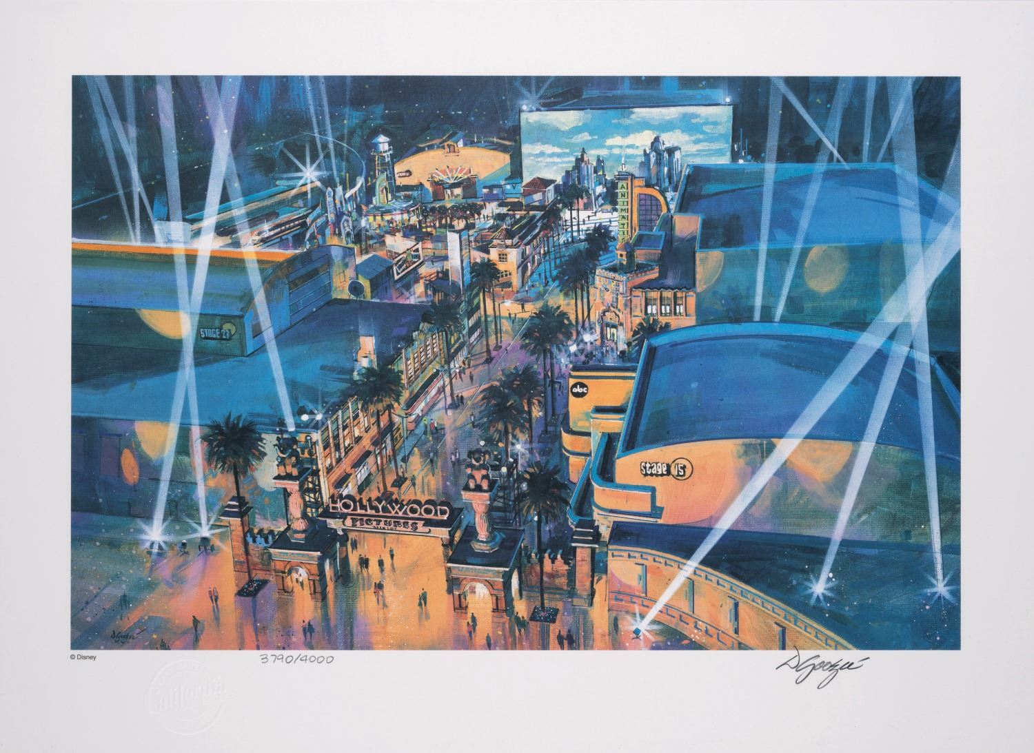 (California Adventure, 2001) A Cast Member lithograph by Disney Imagineering Consultant Artist Dan Goozee. This limited-edition print was prepared in commemoration of the opening of Disney's California Adventure and depicts an aerial view of the Hollywood Pictures Backlot themed land, presented with Goozee's characteristic use of light and color. The item has been autographed and numbered 3790 of 4000 in pencil, with an embossed seal on the bottom left of the print denoting it as part of the California Adventure Cast Member Commemorative Series. The piece measures 14.5"x20" overall with an image area of 11"x17" and is in very fine condition.