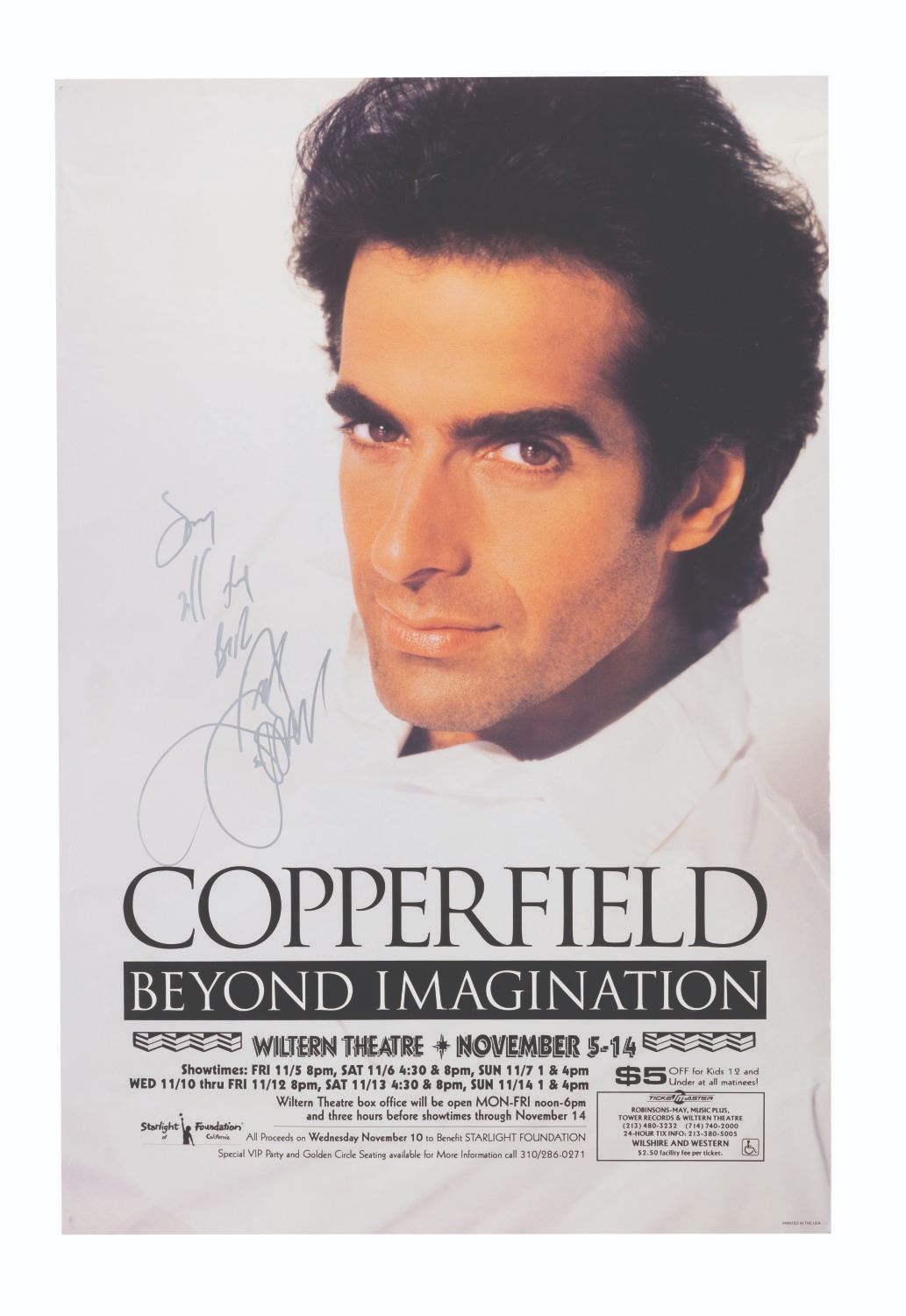 (Copperfield, 1993) A very early David Copperfield tour poster, signed by the illusionist with a dedication. The poster is for Copperfield’s show at the Wiltern Theatre in Los Angeles, titled"Beyond Imagination." Measuring 24" x 36", the poster displays in good condition with small creases throughout, and a scuff in Copperfield’s hair.