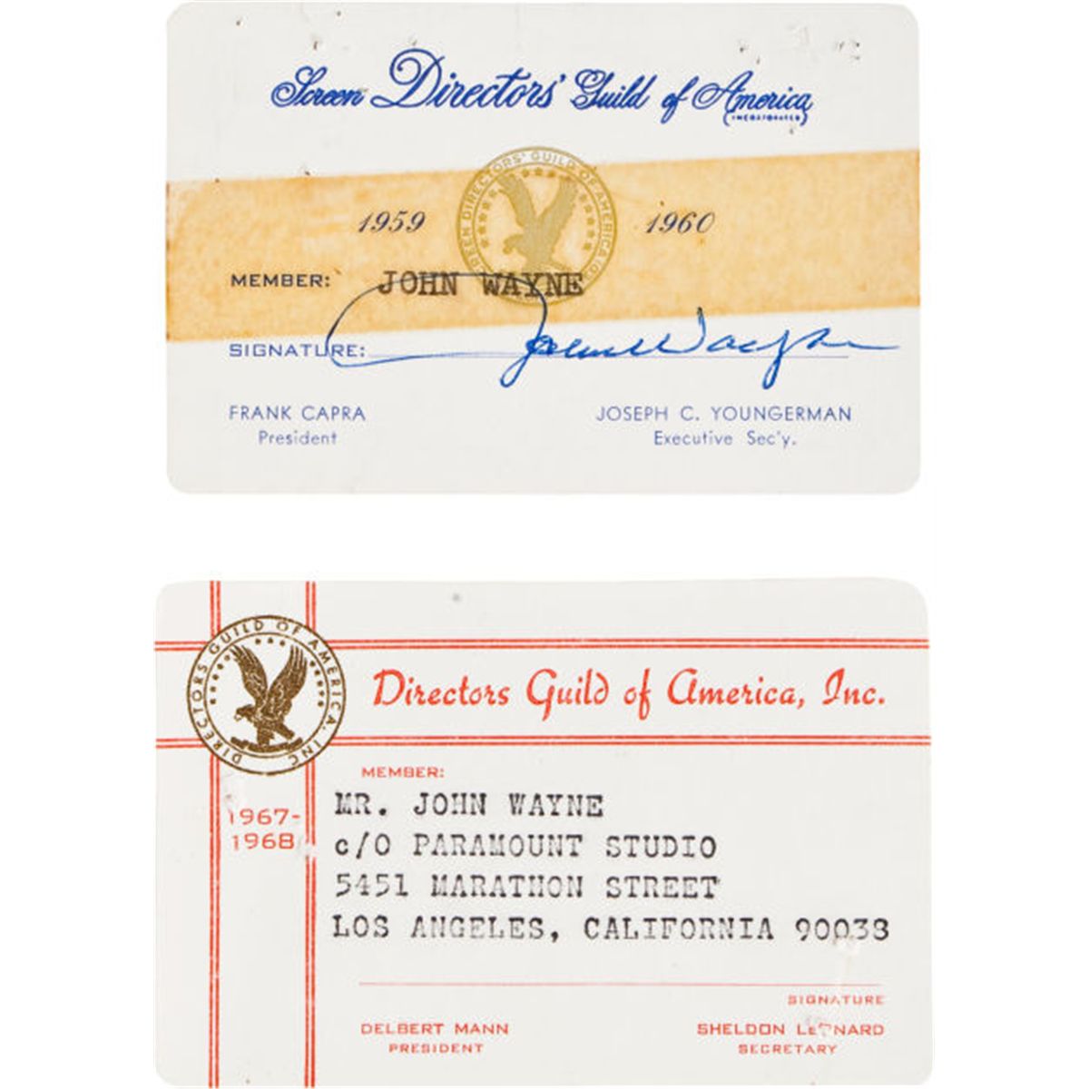 A Signed Directors' Guild of America Membership Card, 1959-1960. With Wayne's typed name above his blue fountain pen ink signature; also included is a second DGA card from 1967-1968 with Wayne's typed name and his Paramount Studios address, though it's unsigned. (Please note the first card has evident Scotch tape residue across its center.)2 1/2" x 3 1/2"