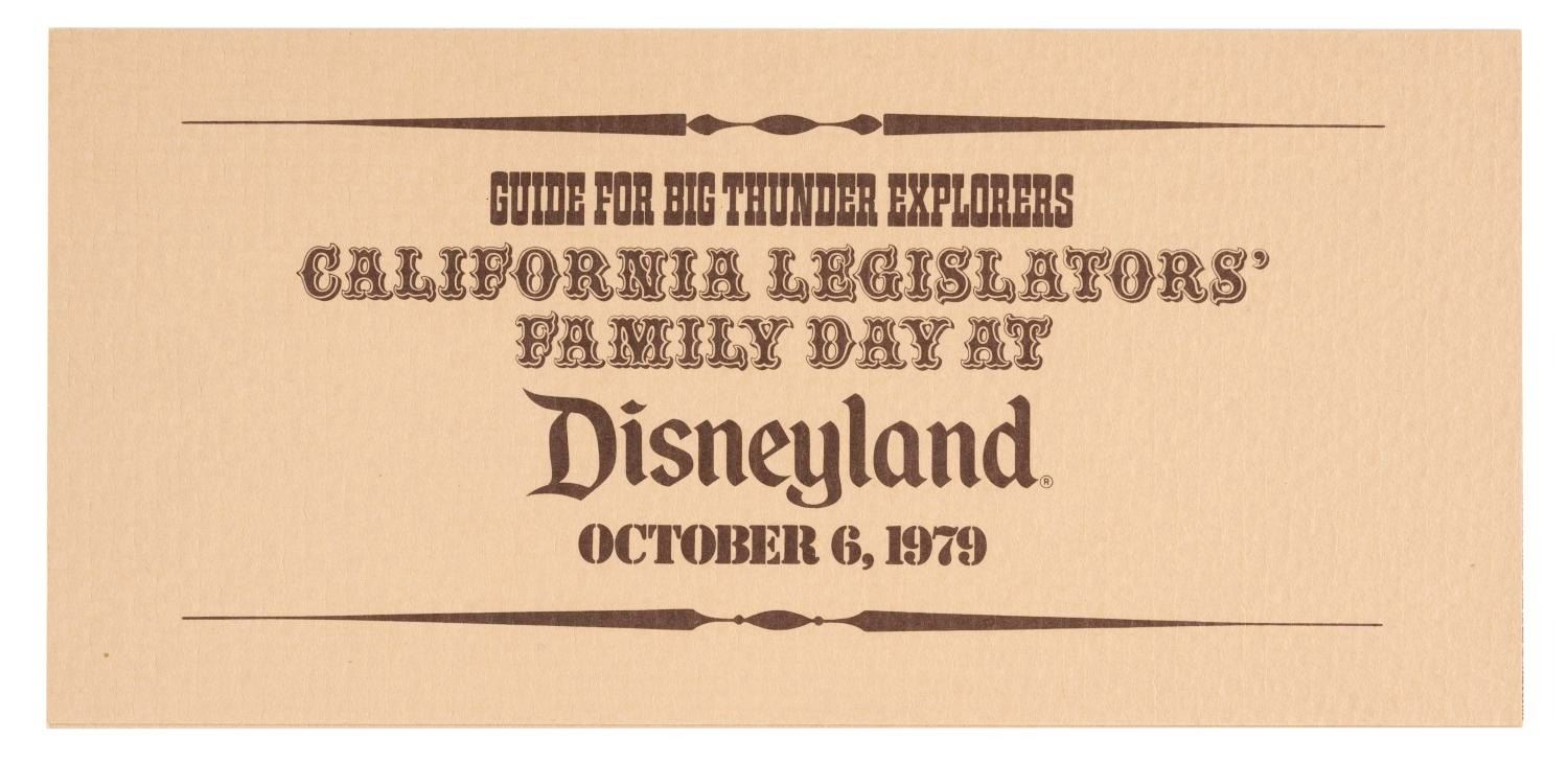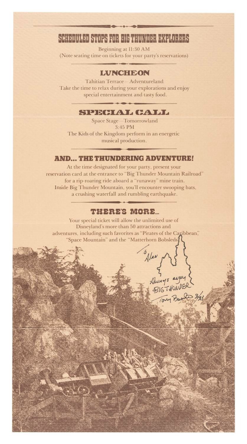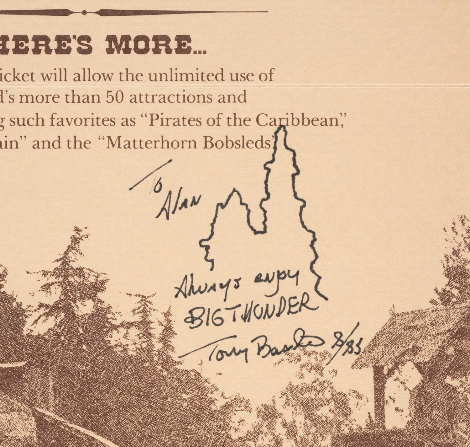 (Disneyland, 1979/1985) A signed California Legislators’ Family Day at Disneyland fold-out schedule from October 6, 1979. The schedule was signed and dated in 1985 with a personalized dedication from Disney Legend Tony Baxter, the brains behind the attraction, who also drew an outline of one of the attraction’s spires. Measuring 4” x 8.75” closed and 8.75” x 16.25” opened, the signed schedule is in fine condition.