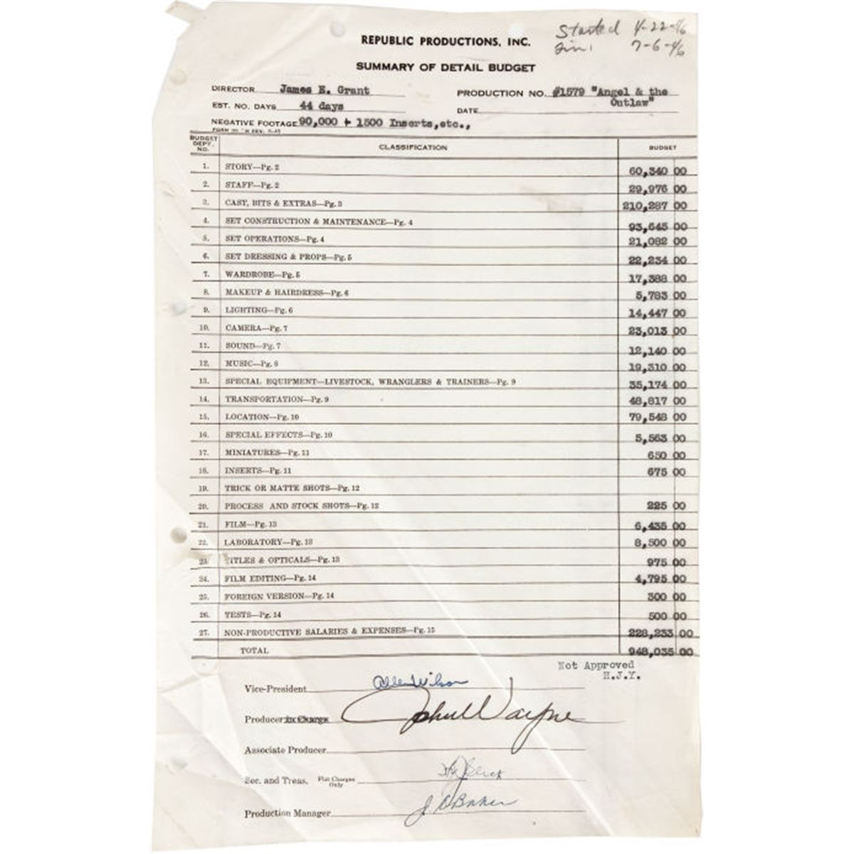 A Signed Document from "Angel and the Badman." Republic, 1947. One page, titled "Summary of Detail Budget," listing the various costs of the production, signed in black fountain pen ink on the lower margin by Wayne (and three others) as he was producer of this film. (Please note the page is now somewhat tattered due to age.)13" x 8 1/2"This was the first film produced by John Wayne himself.