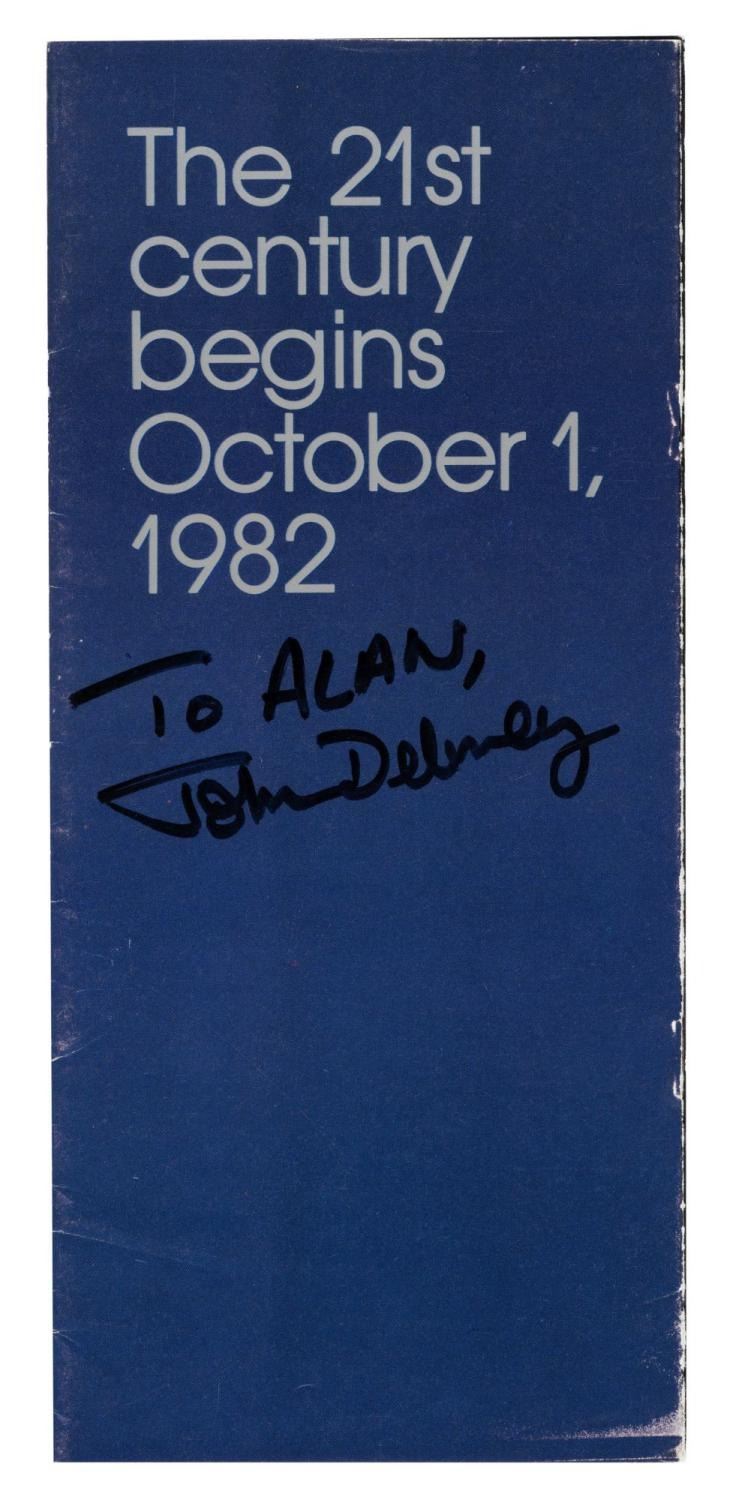 (EPCOT, 1981) An EPCOT Center pre-opening brochure signed on the front by Horizons composer John Debney and an unknown signee on the reverse. Measuring 4” x 9”, the brochure is in good condition with creases and edge wear.