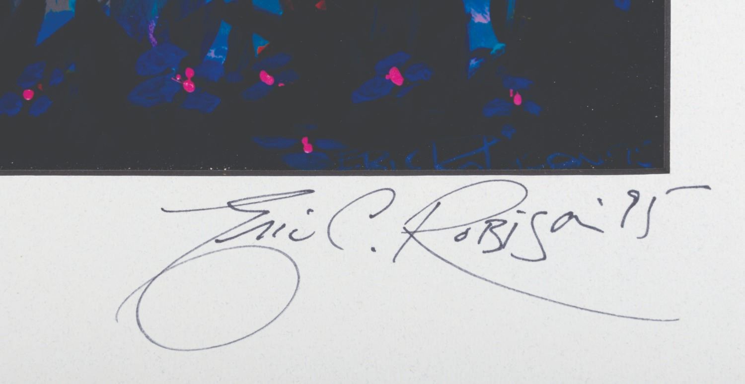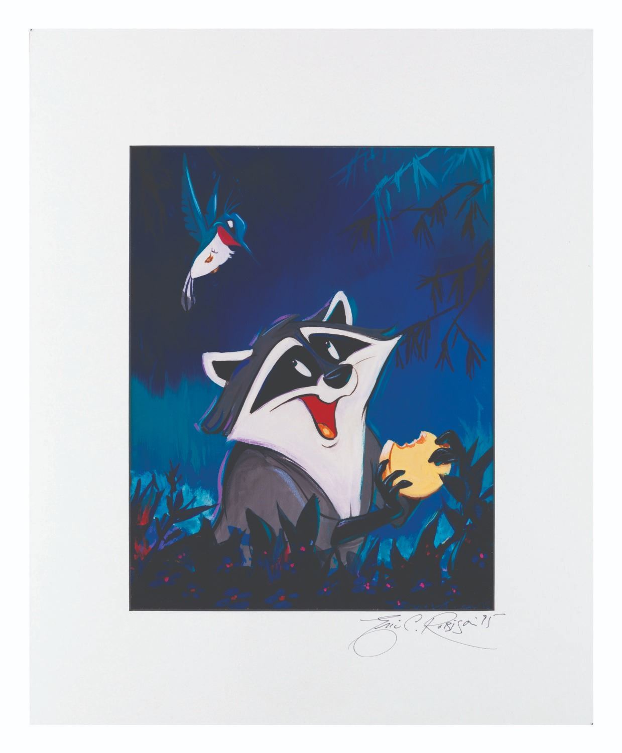 (Disney, 1995) A print of Meeko and Flit from “Pocahontas,” signed in marker by artist Eric C. Robison. Measuring 10.25” x 13.25” in a 16” x 20” matte backed with foam core, the print displays in very good condition with light scratches.