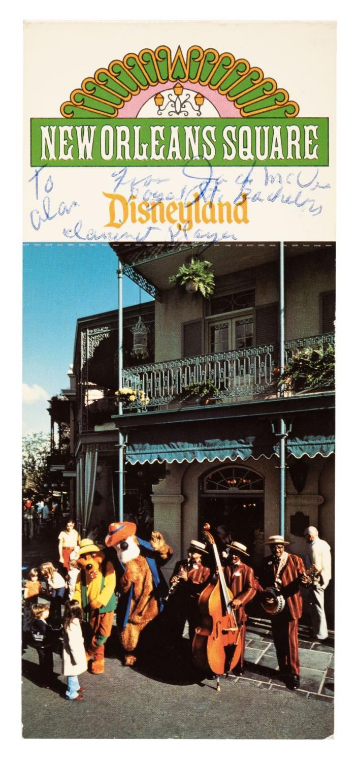 (Disneyland, 1970s-80s) A New Orleans Square postcard book signed with a personalized dedication from Jack McVea, the clarinet player in the Royal Street Bachelors. Inside the book are postcards from The Haunted Mansion and Pirates of the Caribbean. Measuring 3.5” x 8”, the postcard book is in good condition with scratches and wear.