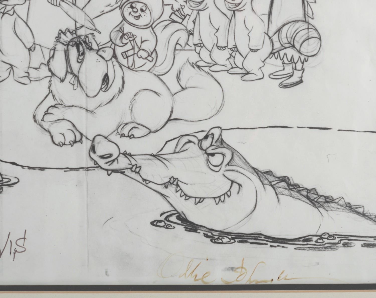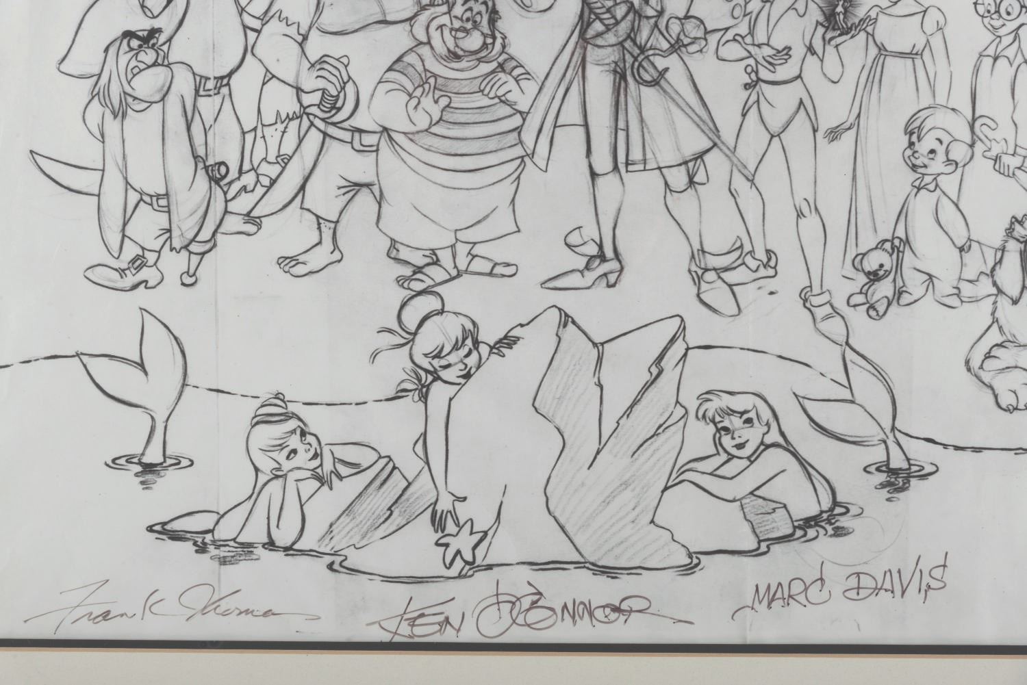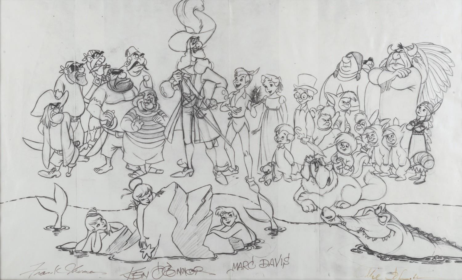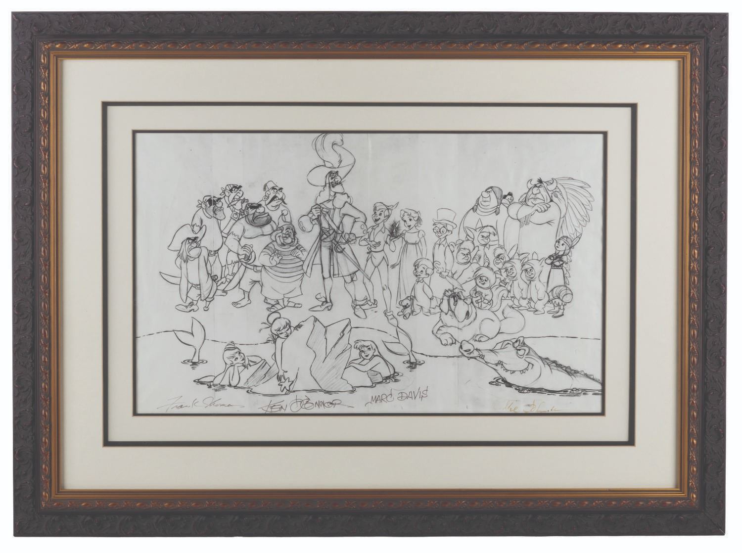 (Disney, 1953) A very rare photostat of the cast of “Peter Pan” signed by four legendary Disney animators. Created in the same style as Disney model sheets, this large and unusual piece depicts 26 characters who appear in the Never Land sequences of the film. The piece is signed by animators Frank Thomas, Ollie Johnston, Ken O’Connor, and Marc Davis. With a visible image size of 11.5” x 19.25” in a 26” x 18.25” matte, the signed piece is in good condition, with handling wear including folds from original production use.