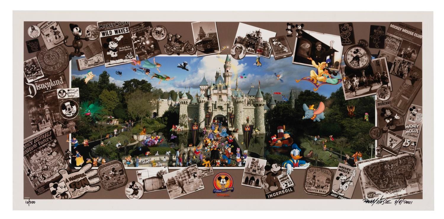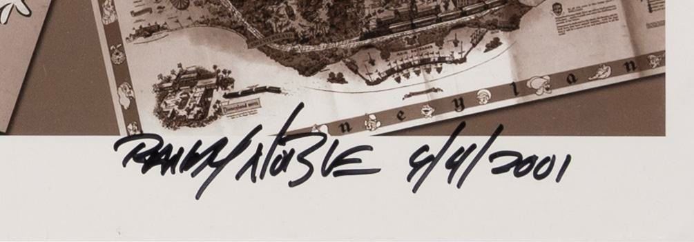 (Disneyana, 2001) A Cast Member exclusive limited edition print titled "A Disney Family Reunion" designed and hand-signed in marker by Randy Noble for the 2001 Disneyana Convention. Measuring 18" x 38" the print is in good condition with wear to both the left and right edges, including creasing that doesn't affect the image.