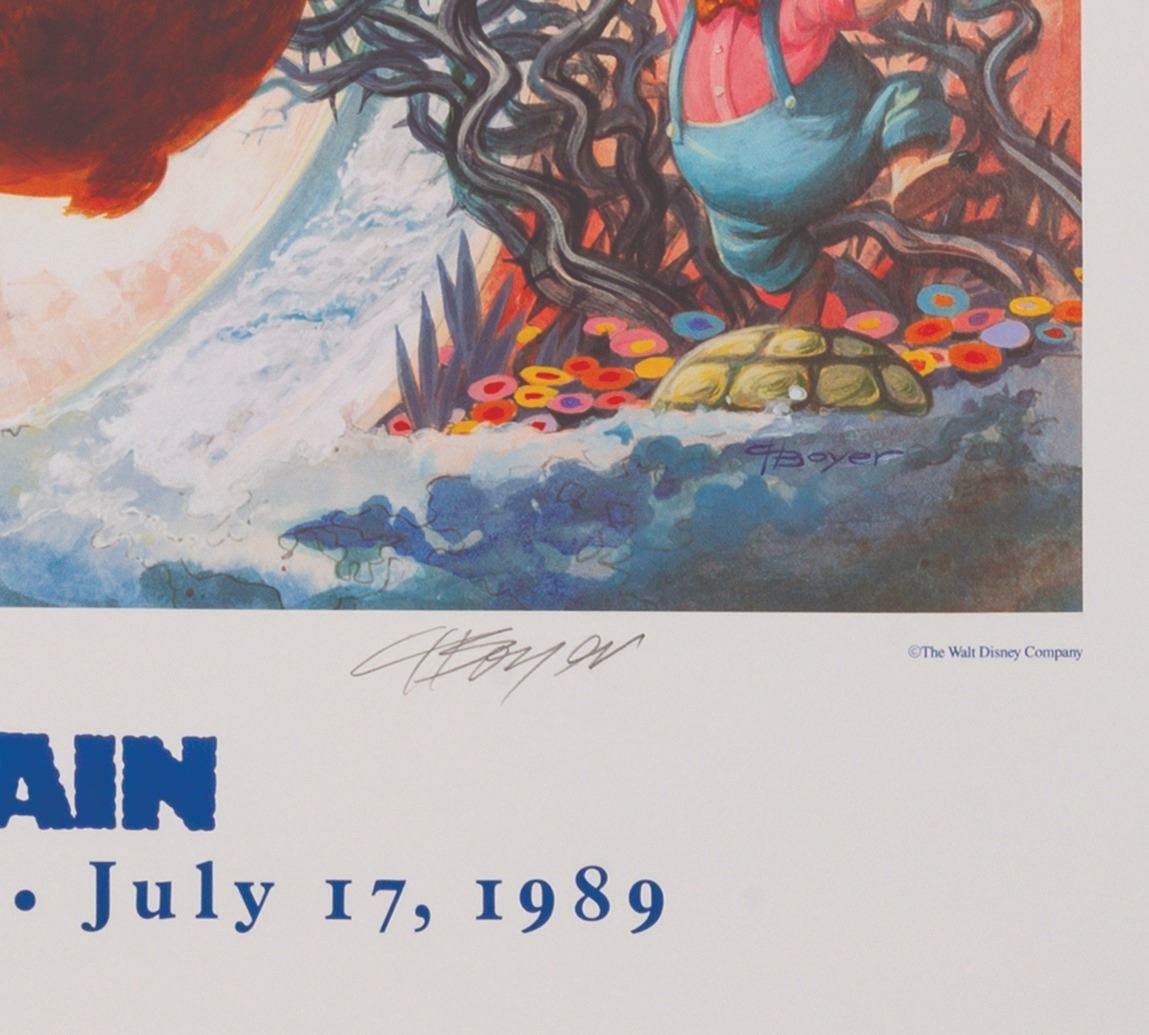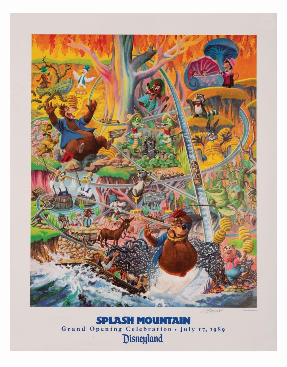 (Disneyland, 1989) A Limited-Edition "Splash Mountain Grand Opening celebration" print signed by artist Charles Boyer. The attraction's timeless critters are presented in colorful vignettes, in a limited-edition print distributed on July 17th, 1989. The Limited-Edition Print bears a low number "24/1,000" and is signed by the late Disneyland Master Artist Charles Boyer. Measuring 30"x24", the high-quality print is in good condition with minor edge wear a few small spots of very light discoloration, and a small tear to border area.