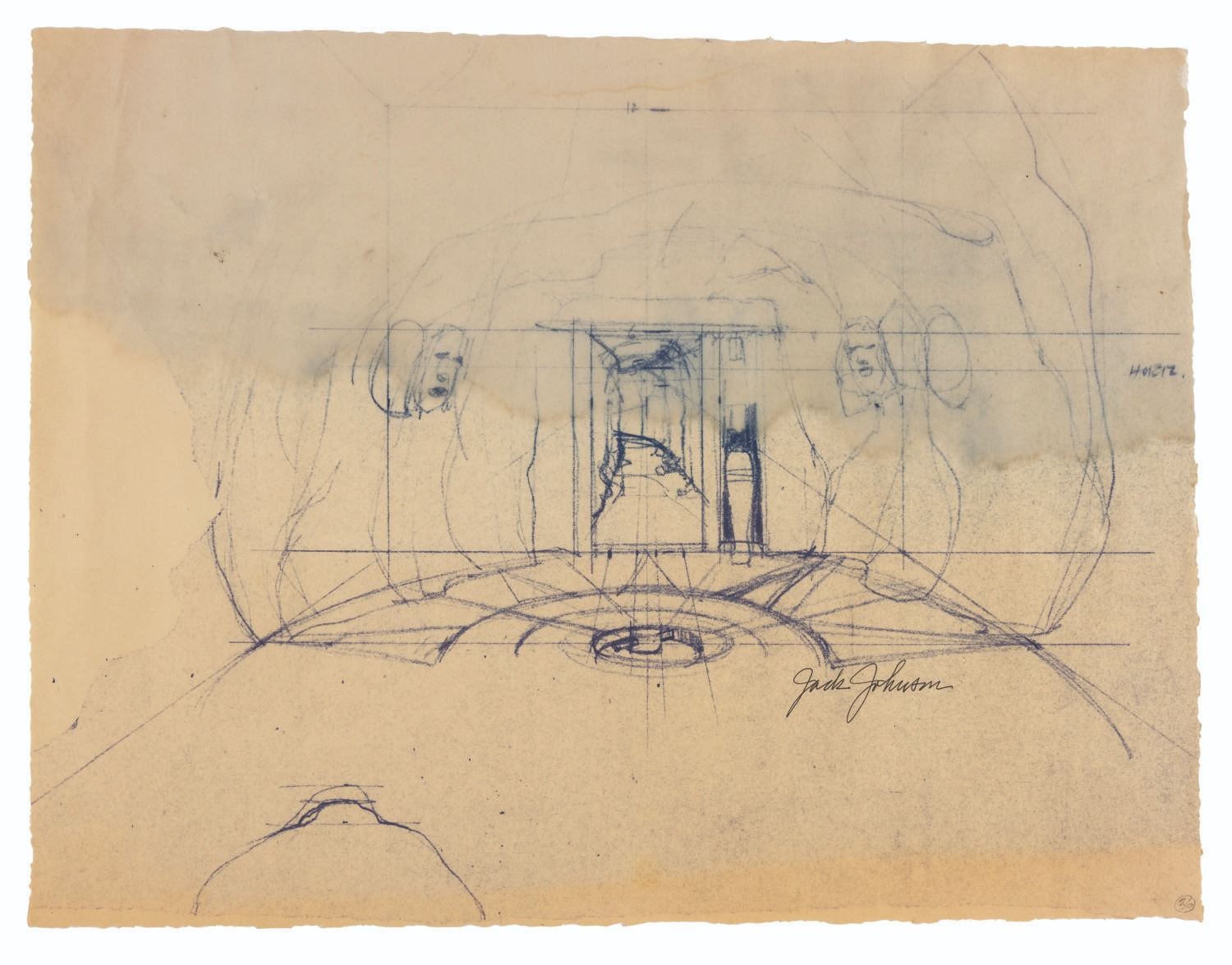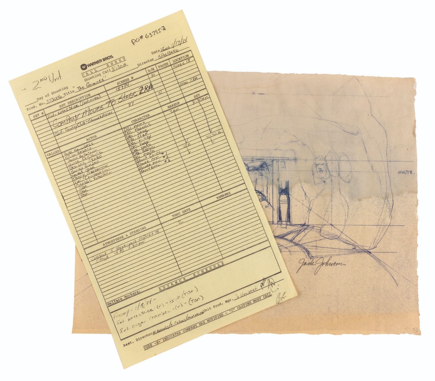 (Warner Bros., 1984) An original production-used blueprint of an underground set from "The Goonies” signed by production illustrator Jack Johnson. Accompanying the blueprint is a second unit call sheet for a day of filming waterslide and shower room scenes. Measuring 11.75” x 15.75", the blueprint displays in fair condition with creasing and heavy water damage across the entire upper half. The call sheet measures 14” x 8.5” and is in good condition with edge wear, creasing, light stains, and a horizontal fold in the center.