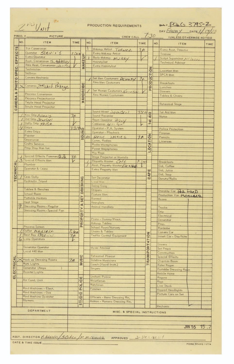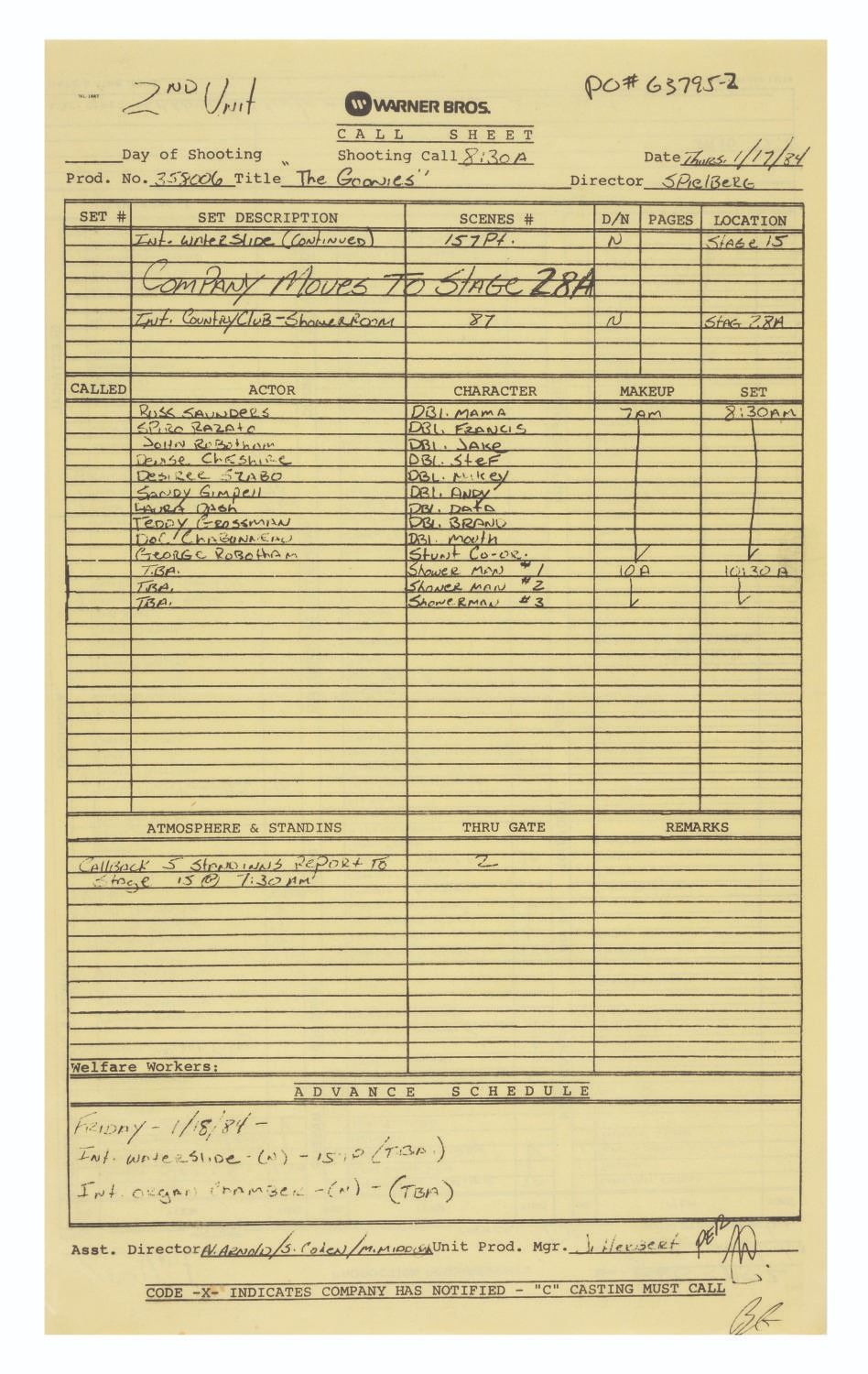 A Signed  The Goonies” Production Blueprint and Call Sheet.
