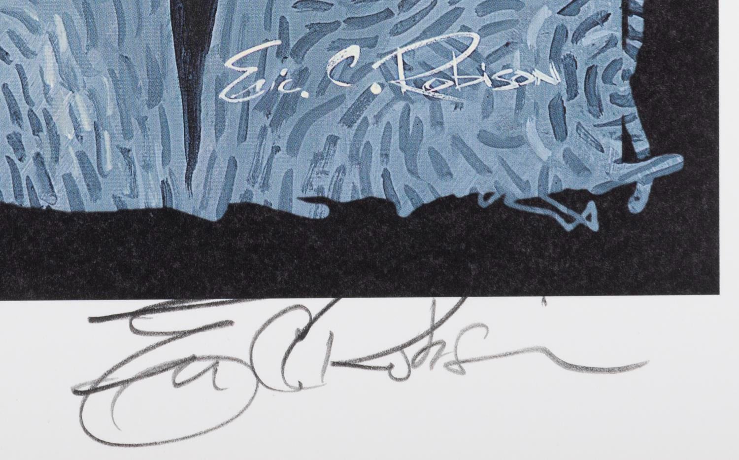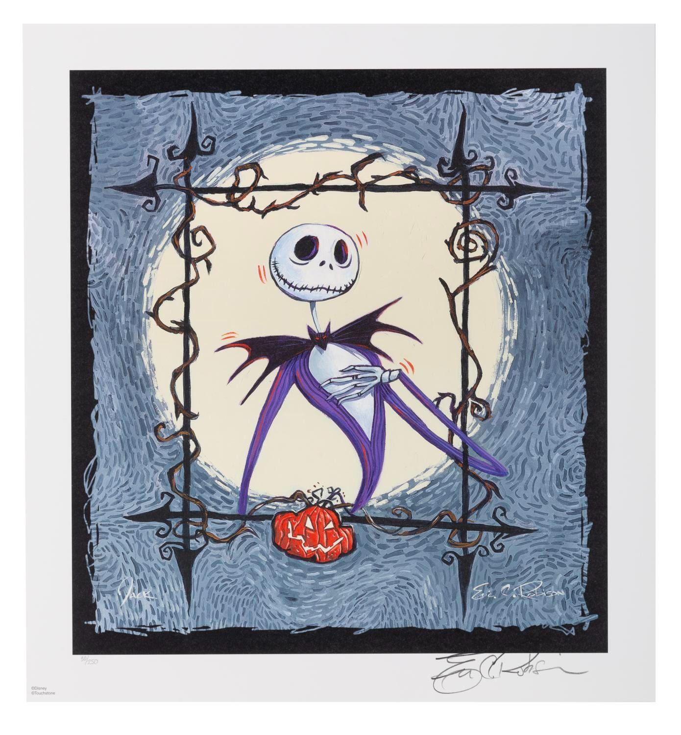 (Disneyland, 2002) A limited edition lithograph titled"The Pumpkin King Portrait" signed by artist Eric Robison. This piece was created for the"Nightmare Before Christmas" Haunted Mansion Holiday event. Measuring 13" x 14" with an image size of 12" x 11", the signed print numbered 30/250 is in fine condition.