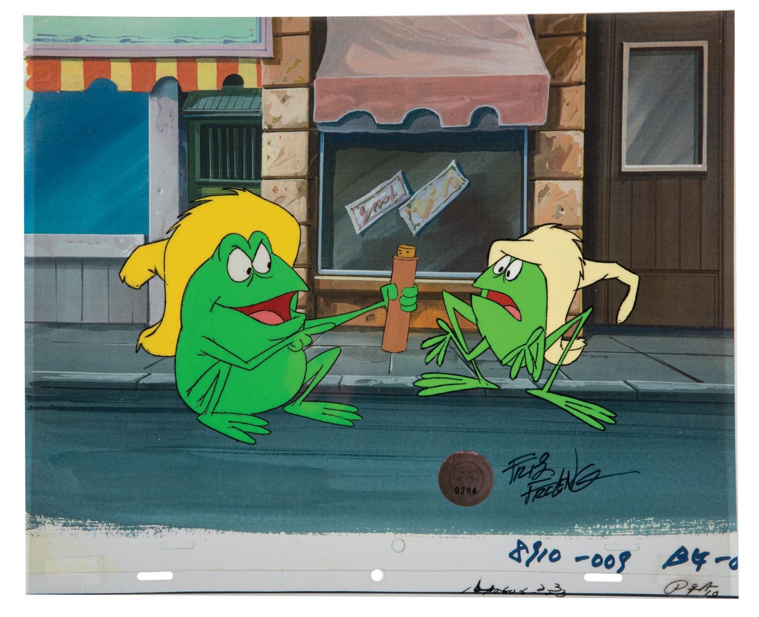 (DePatie-Freleng/United Artists, 1970s) An original production cel of the Tijuana Toads, signed by legendary director Friz Freleng. The untrimmed cel measures 10.5"x12.5" and is in fine condition.