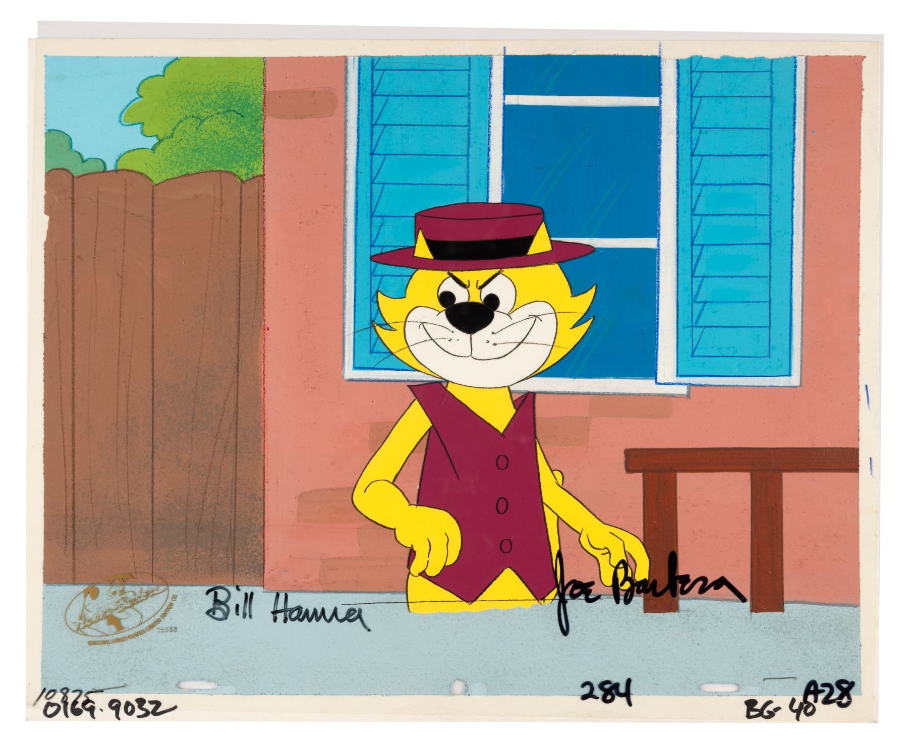 (Hanna-Barberra, 1988) An original hand-painted production cel and background from “Top Cat and the Beverly Hills Cats,” signed by series creators Bill Hanna and Joe Barbera. With a character image size of 6” x 4.75” on a 10.5” x 13” cel and background, the piece is in very good condition with light wear from production use and two 0.5” staples along the bottom of the cel which attach to the background.