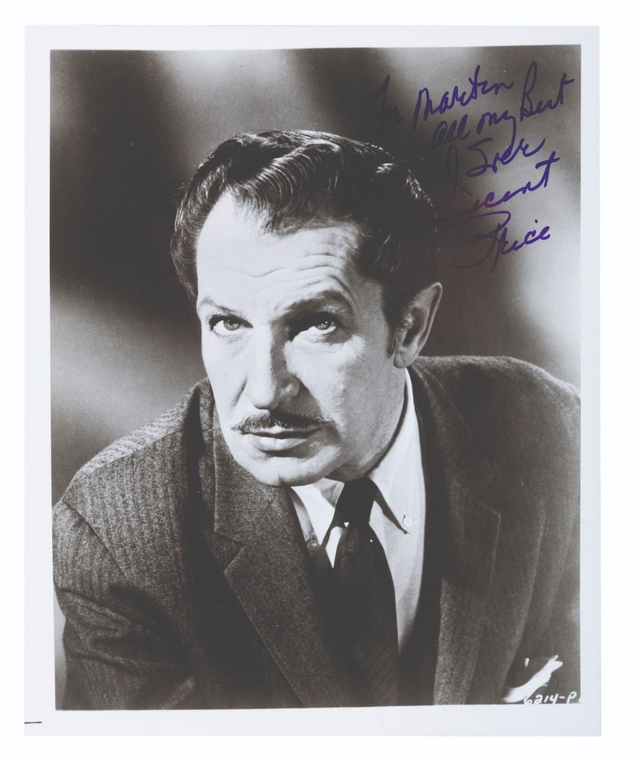 (Vincent Price, 1970s-90s) A headshot of horror legend Vincent Price, signed in blue ink with a dedication. Measuring 8” x 10” the photo is in fine condition.