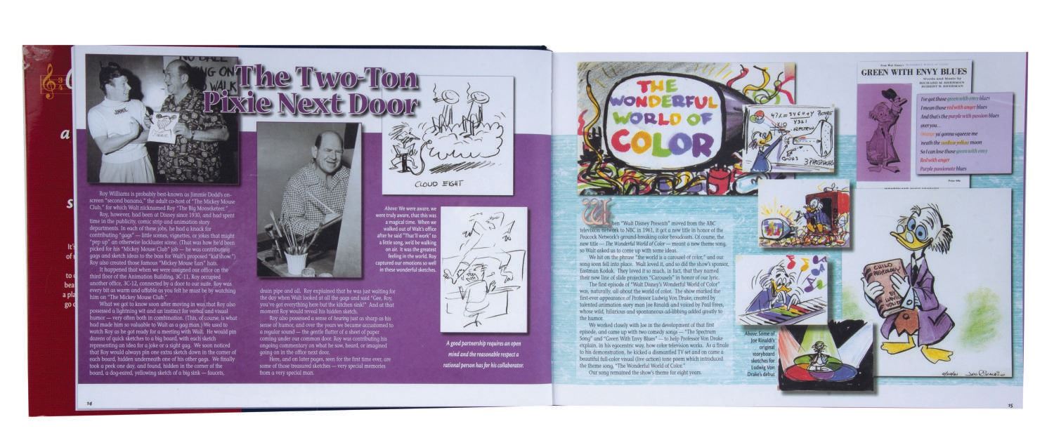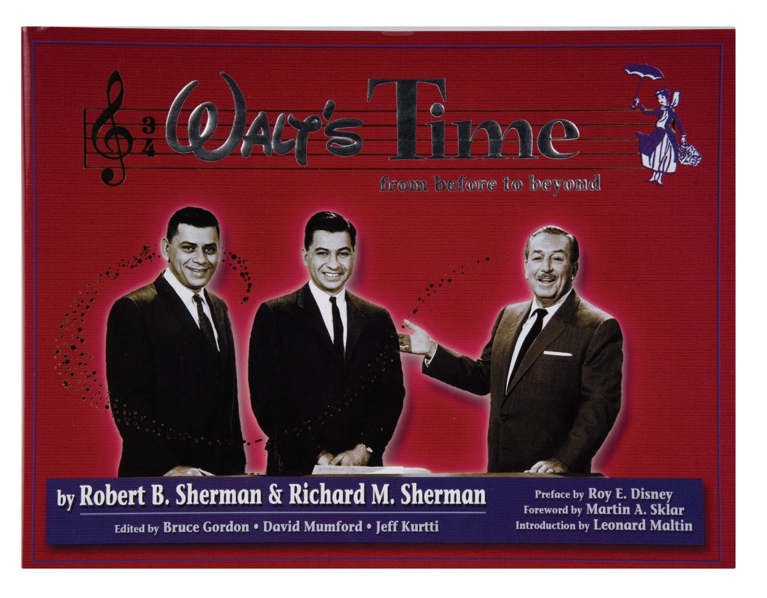 (Disney/Camphor Tree, 1998) A first edition copy of "Walt's Time - From Before and Beyond" signed by authors Bruce Gordon and David Mumford, and Richard Sherman. The book tells the story of the Sherman Brothers' song writing career. Measuring 5"x13"x1.75", the publication is in fine, as-new condition.