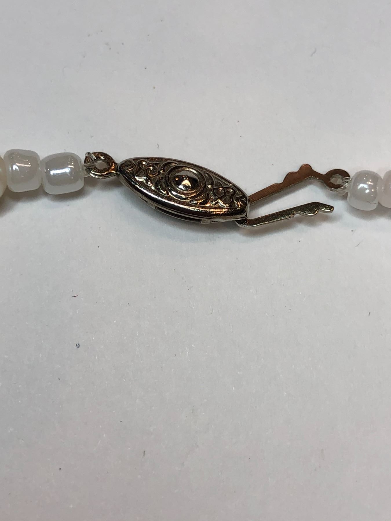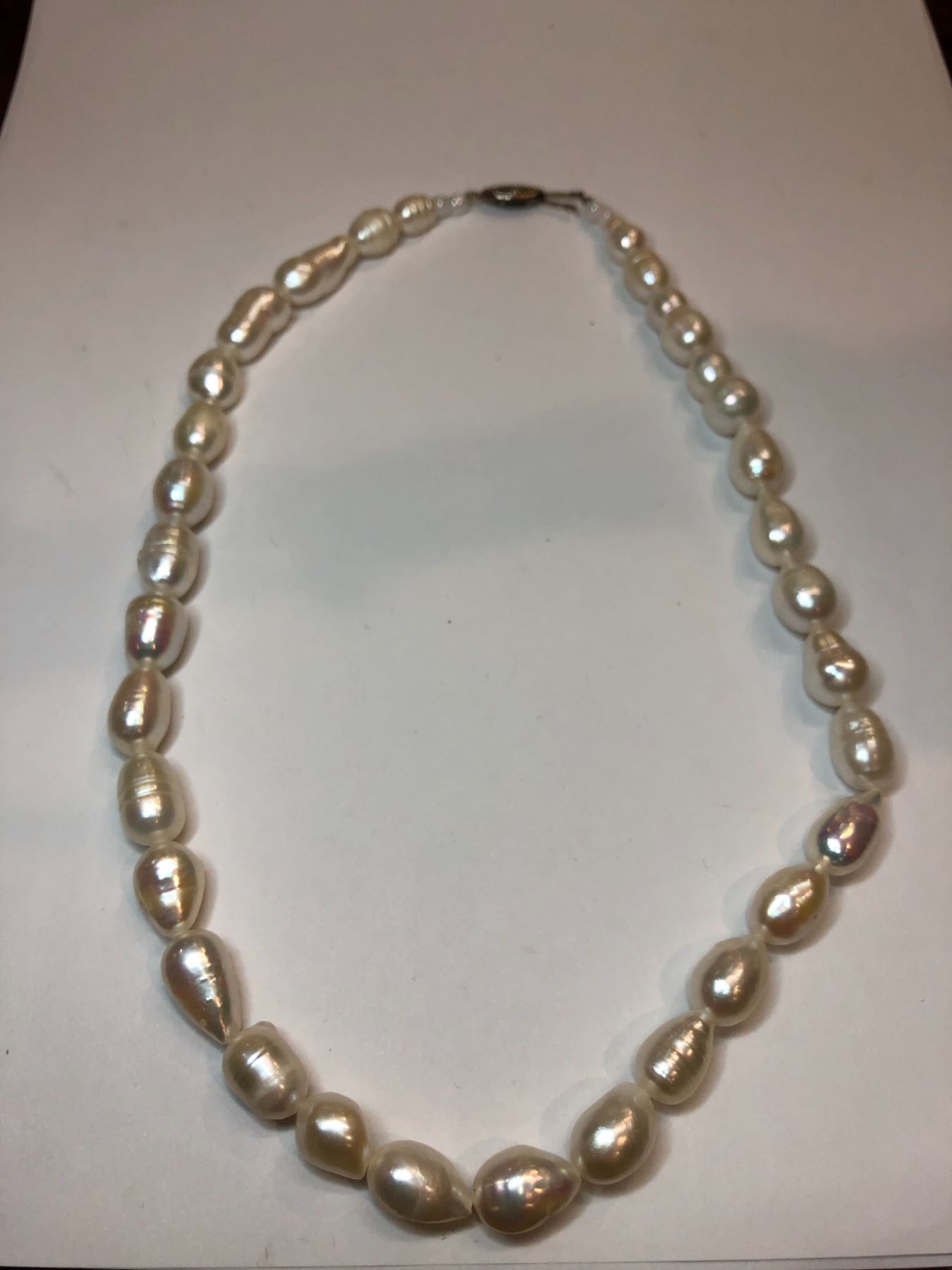 A Single Strand of Cultured Fresh Water Pearls with White Metal Clasp Weight: 55g Length: 18 Inches Stones: Light Cream with Pink and Green Overtone Colors Luster: Medium/High
