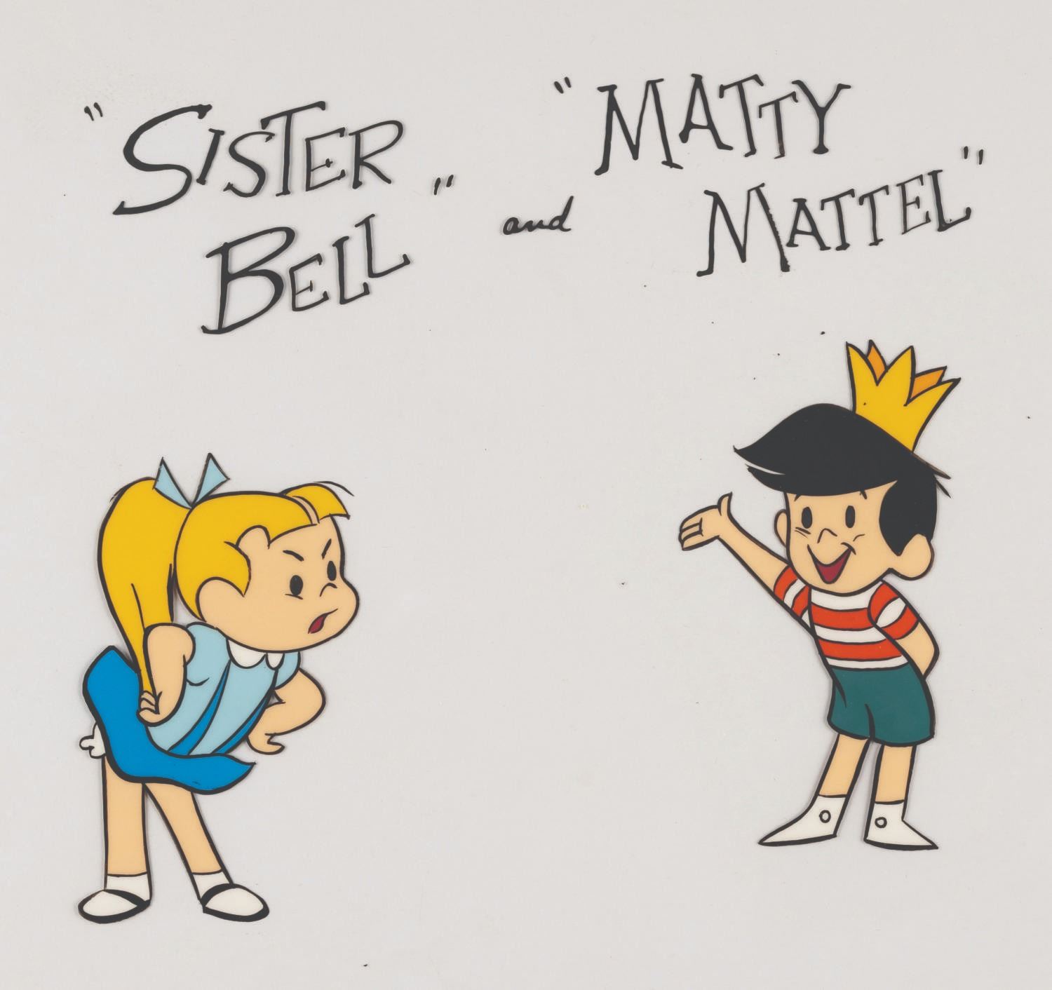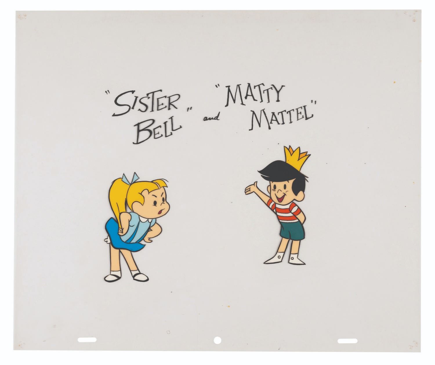 (Clampett, 1970s-80s) An original hand-painted cel of Sister Bell and Matty Mattel, the hosts of the Mattel-sponsored anthology series “Matty’s Funnies” which debuted the “Beany and Cecil” cartoons. The boy and Sea Serpent became so popular that the series was renamed “Matty’s Funnies with Beany and Cecil,” and finally simply “Beany and Cecil.” With an image size of 6” x 6.5” on a 10.5” x 12.5” cel, the piece is in good condition with paint loss, scratches, and pinholes at the corners from display.