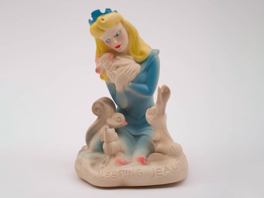 (Disney, 1960s-70s) A rubber toy of Princess Aurora and her forest companions from"Sleeping Beauty." Measuring 4" x 4.75" and 6" tall, the toy is in very good condition with wear and discoloration from age.
