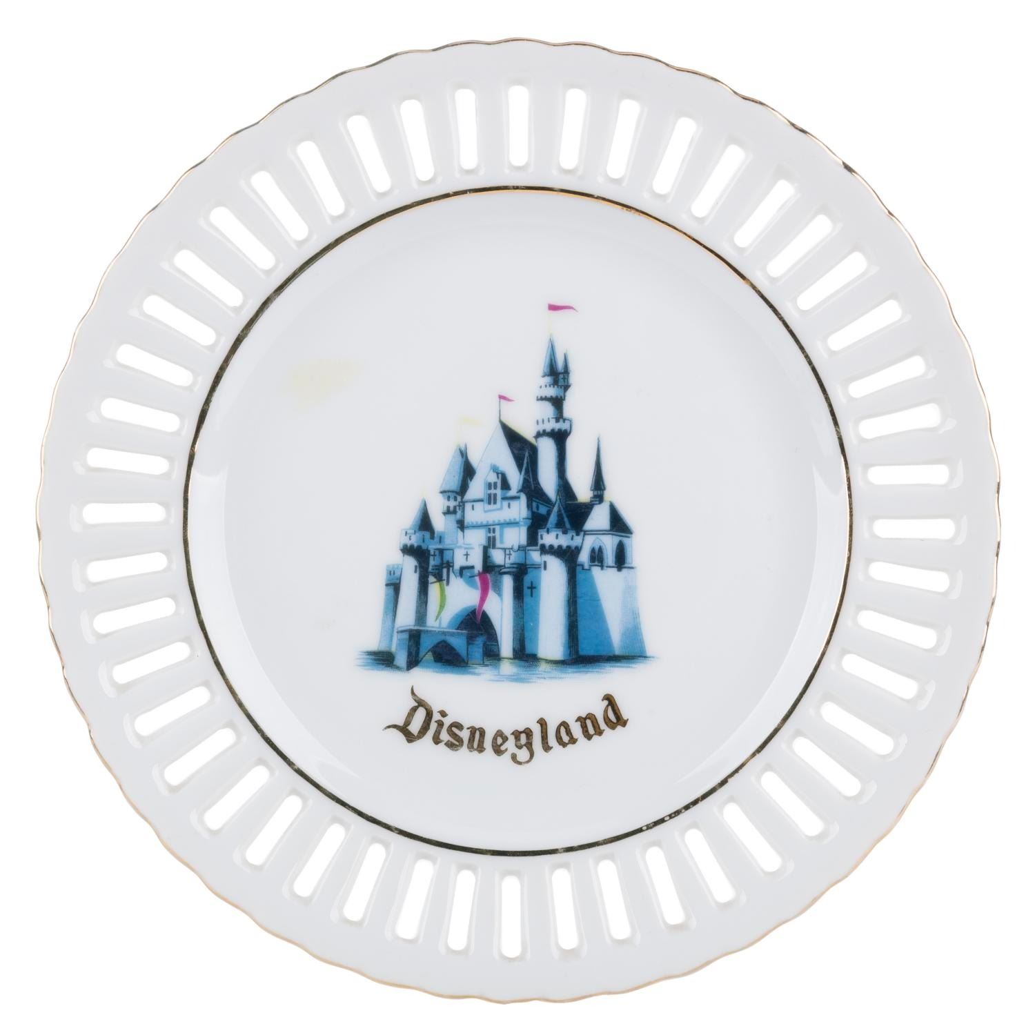 (Disneyland, 1960s-70s) A souvenir decorative plate featuring Sleeping Beauty Castle and a slotted pattern with a gold accent. Measuring 7.25” in diameter, the plate is in good condition with sticker residue in the top left corner, light scratches, and wear.