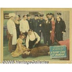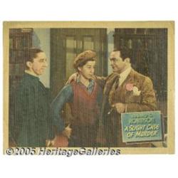 <B>A Slight Case of Murder (Warner Brothers, 1938)</B></I> Lobby Cards (2) (11" X 14"). Remy Marco, a bootlegger during Prohibition, has a new problem now that beer is legal again. No one will buy his beer because it tastes terrible! Edward G. Robinson is Marco in this comedy of errors that involves a half million bucks hidden in his summer home, four corpses that keep moving around and a new son-in-law who is a cop! Pinholes, corner creases, folds with scuffing and the toning that is usual with Warner Brothers linen stock. Very Good/Fine. 2 items