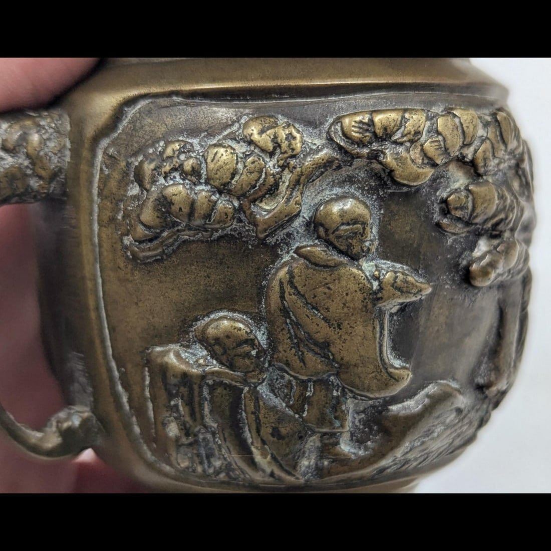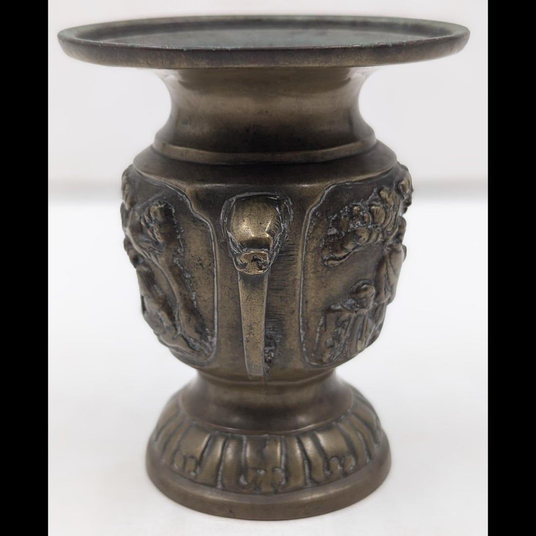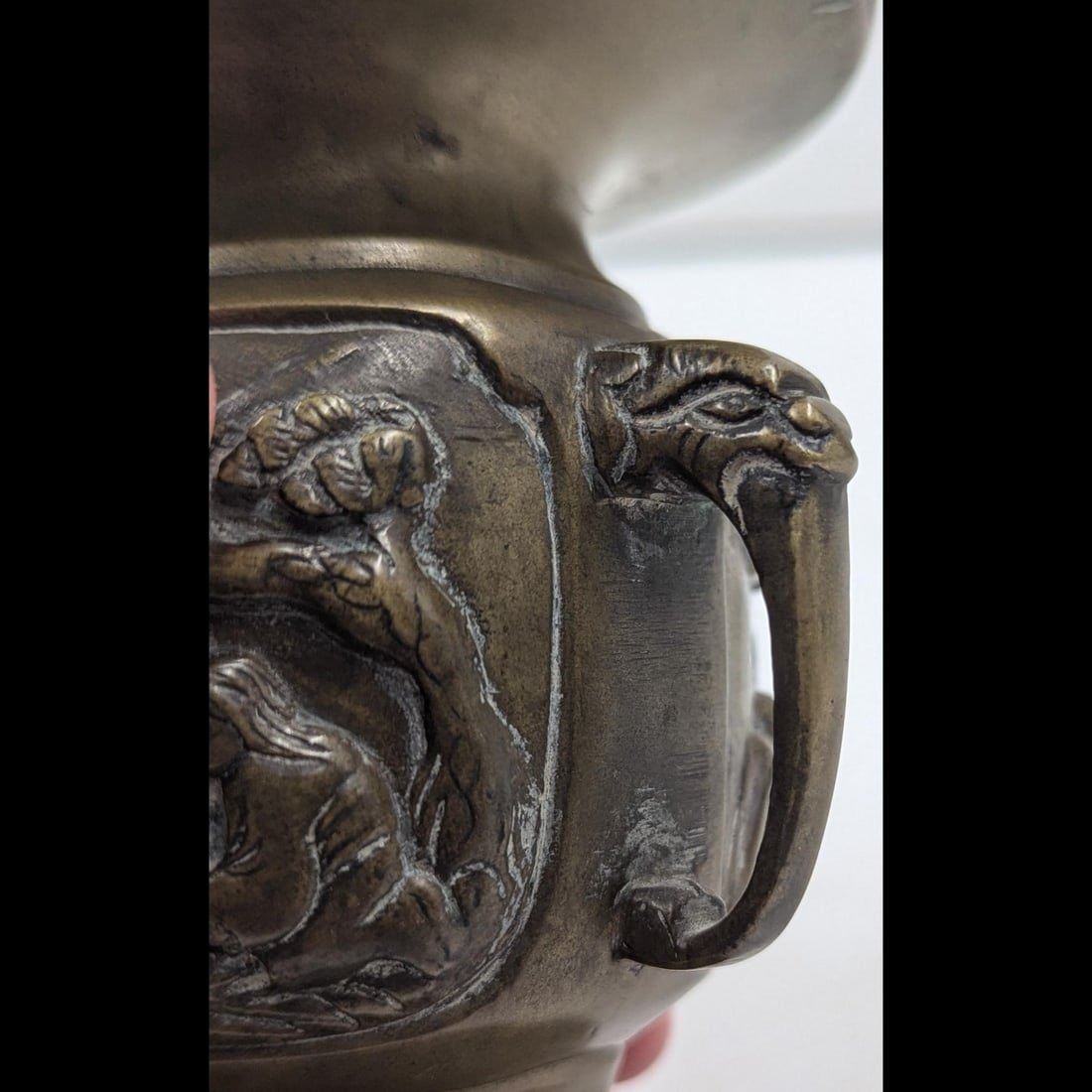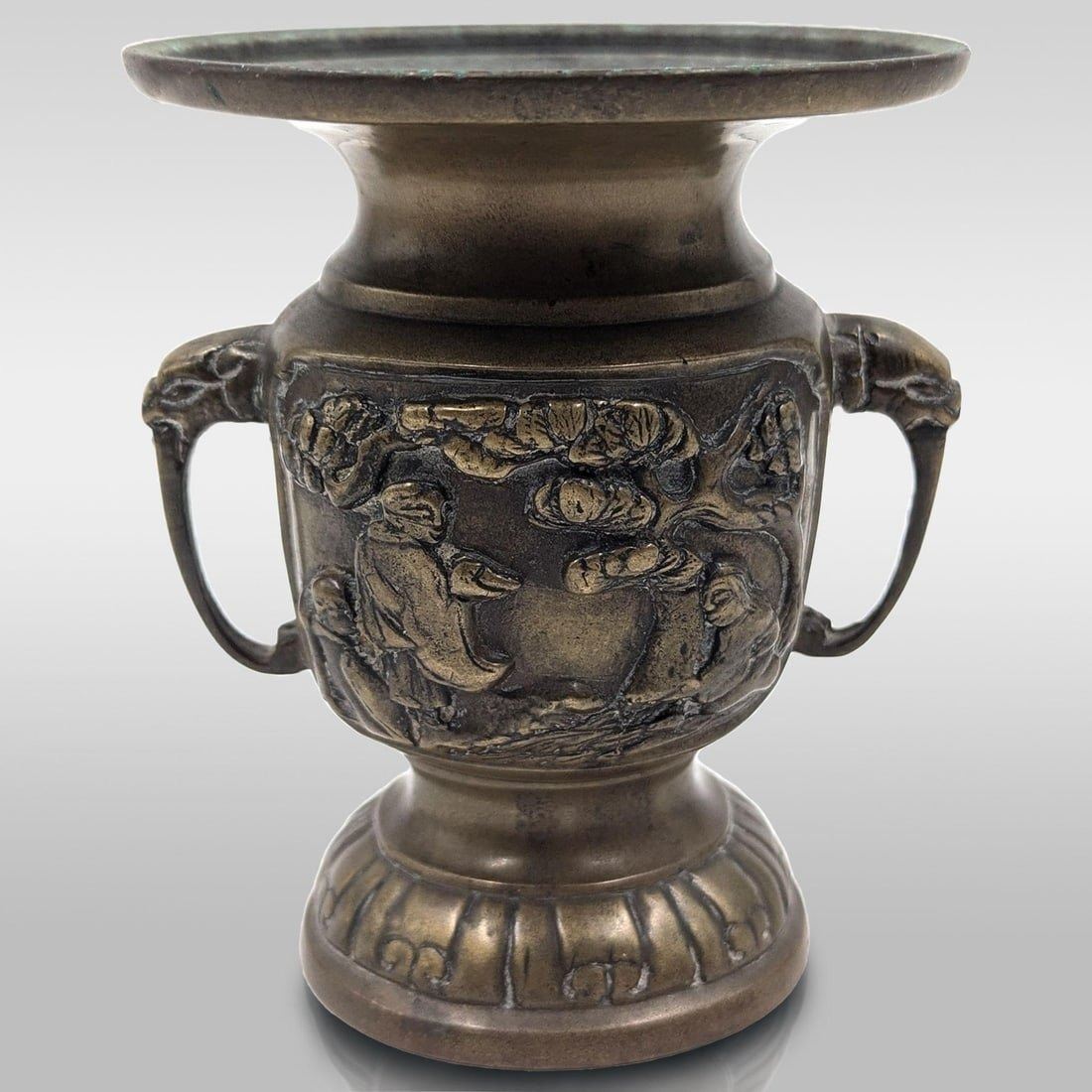 A Small Antique Chinese Brass Relief Vase With Elephant Handles. Measures approx. 4 1/2" X 3 1/2".