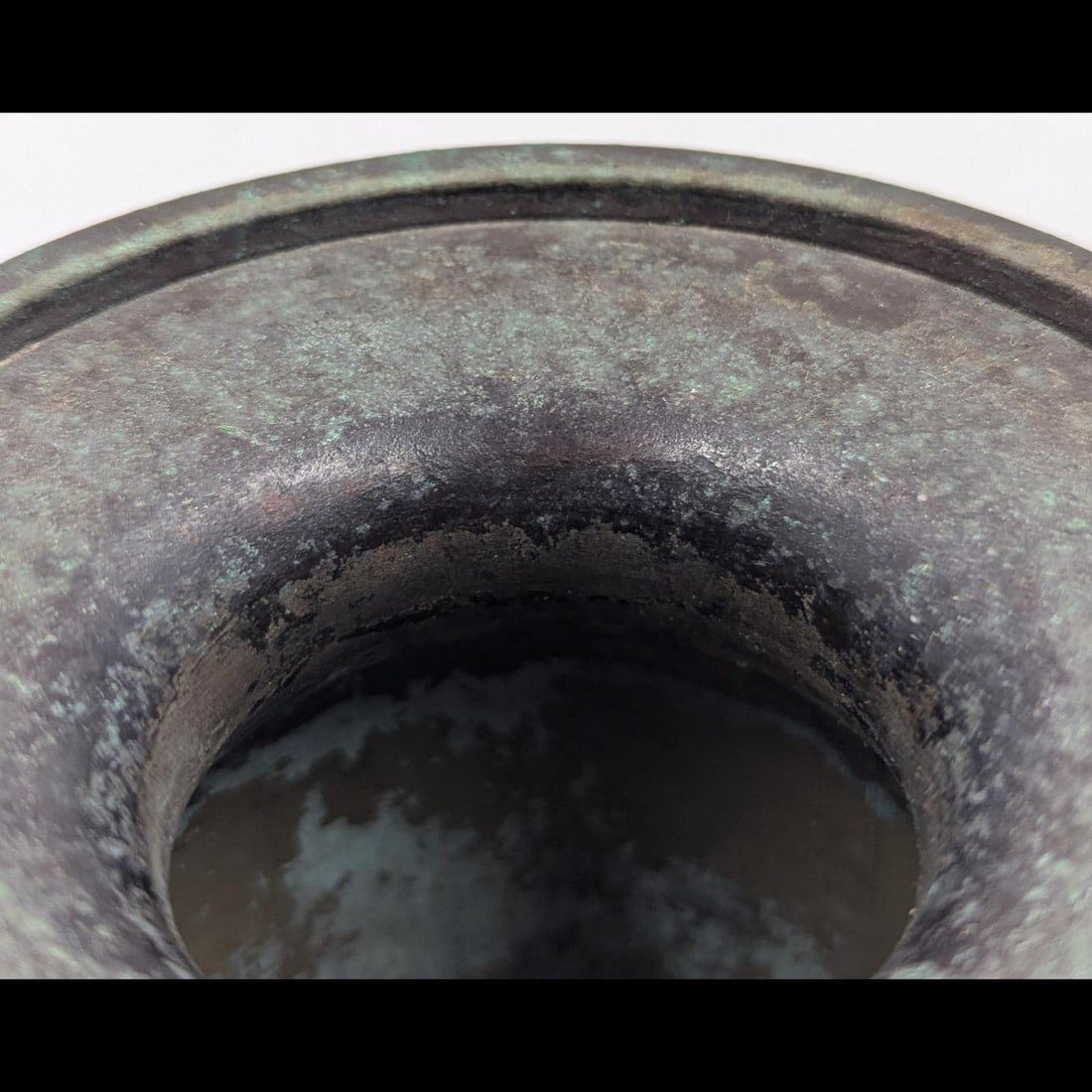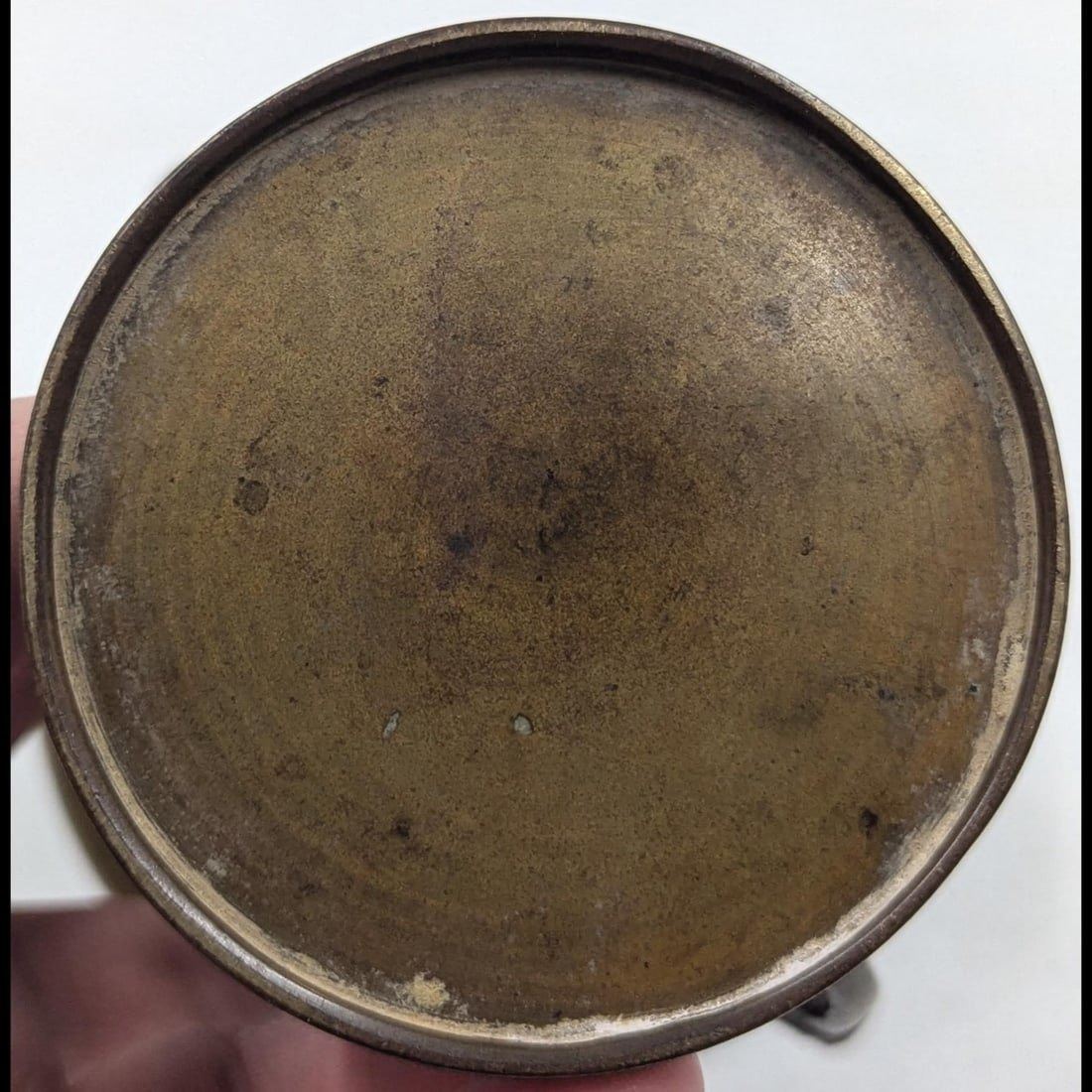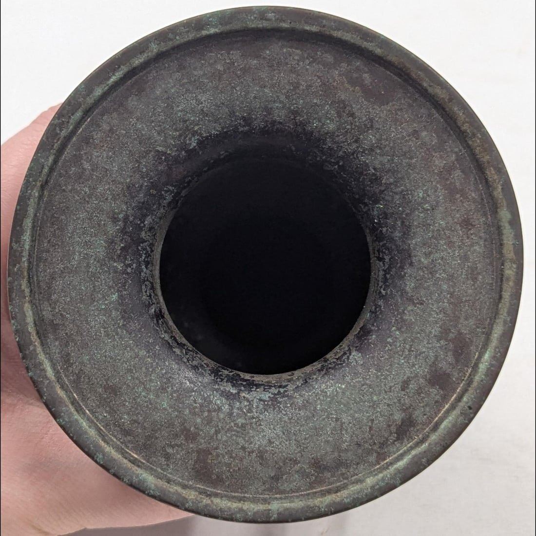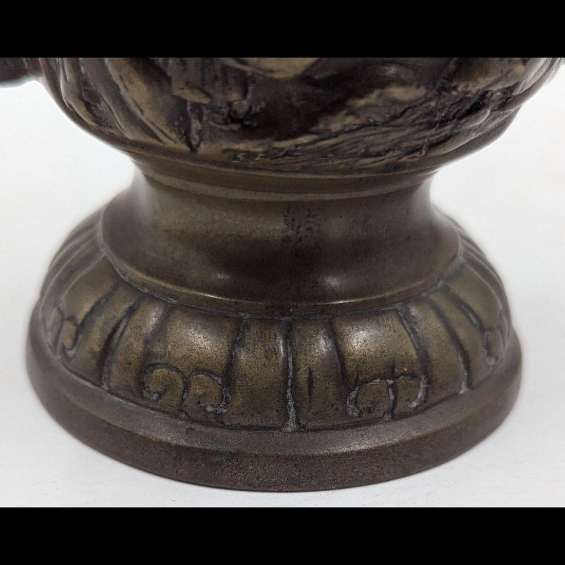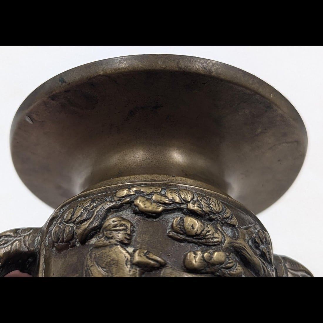 A Small Antique Chinese Brass Relief Vase With Elephant Handles. Measures approx. 4 1/2" X 3 1/2".