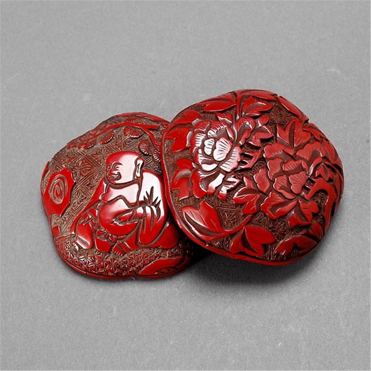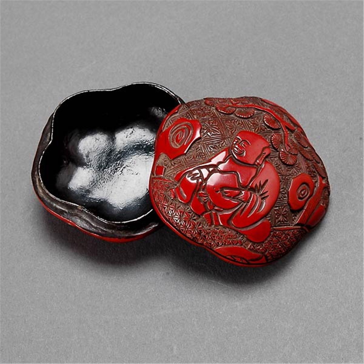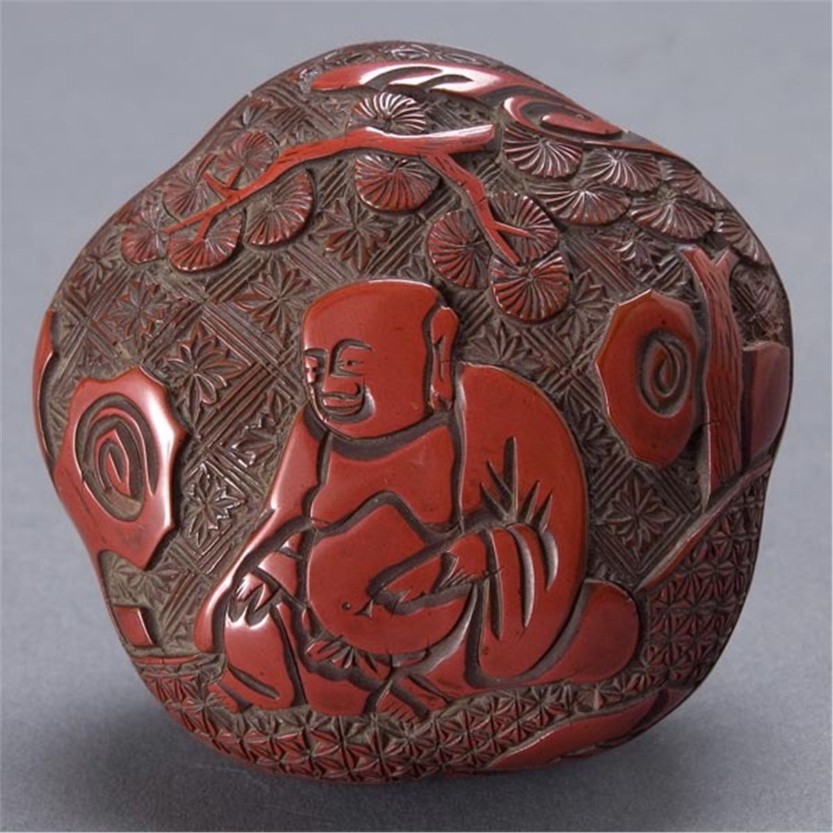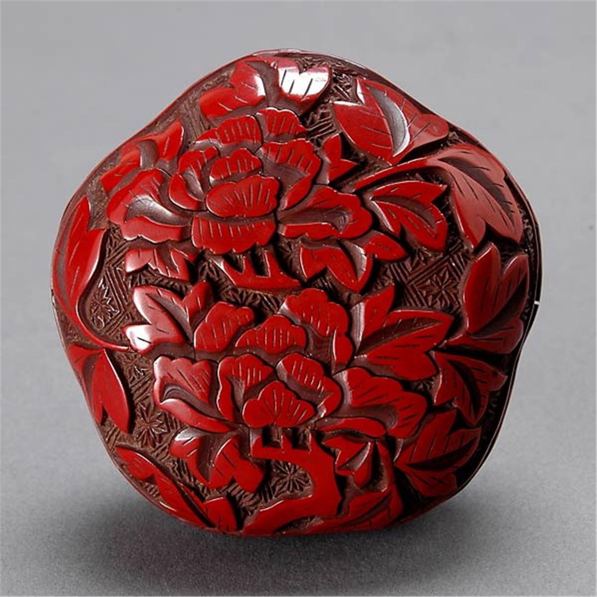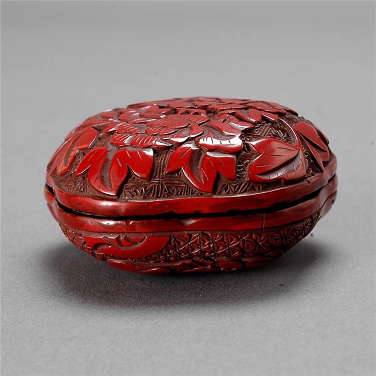 A Small Cinnabar Lacquer Covered Box, Of pentagonal form, finely carved through the layers of cinnabar, depicting a monk sitting next to rocks beneath a pine tree, reversed with leafy peony flowers, all against a patterned flower ground, the interior of the box painted with black lacquer. 17th/18th Century, Width: 2 3/4 inches (7 cm) [Good patina. Some cracks and discoloration to the cinnabar. This condition report states major condition issues only.]