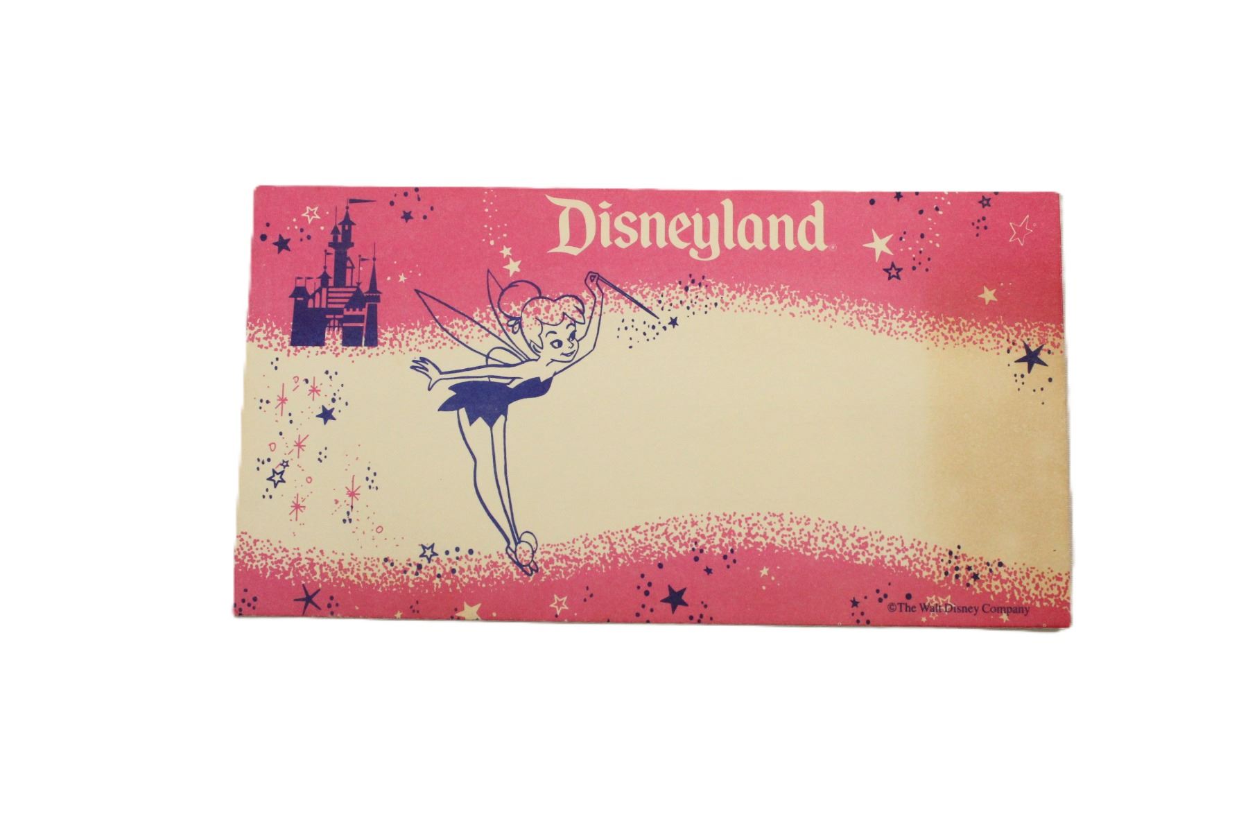 (Disneyland) A small pink envelope featuring Tinker Bell and Sleeping Beauty Castle. Envelopes like these were used for ticket distribution at the Employee Center, making it a very rare find! This envelope measures 3.5" x 6.75" and is in very fine condition with just a tiny wrinkle on the front.
