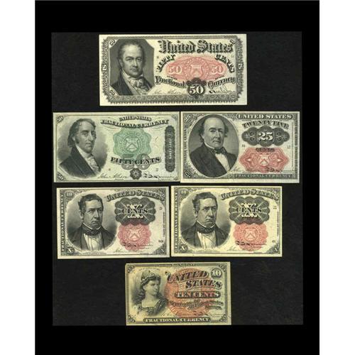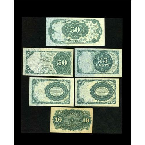 <B>A Small Hoard of Fractionals</B></I><BR>Fr. 1259 10¢ Fourth Issue <B>New,</B></I> nipped tip<BR>Fr. 1265 10¢ Fifth Issue <B>Choice New</B></I><BR>Fr. 1266 10¢ Fifth Issue <B>Choice New</B></I><BR>Fr. 1309 10¢ Fifth Issue <B>Choice New</B></I><BR>Fr. 1379 50¢ Fourth Issue <B>New,</B></I> pinhole<BR>Fr. 1381 50¢ Fifth Issue <B>Choice New</B></I>.<BR>A nice start on a Fractional type set.<BR>