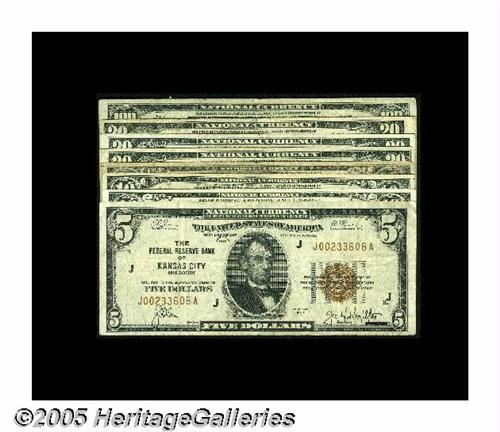 <B>A Small Hoard of Mixed Denomination 1929 Federal Reserve Bank Notes</B></I><BR>$5 1929 Kansas City VF<BR>$10 1929 Boston VF<BR>$10 1929 New York (2) F, VF<BR>$20 1929 Boston (2) VF, EF<BR>$20 1929 New York VF<BR>$100 1929 Richmond VF.<BR>$195 face value in circulated, but quite presentable notes.<BR>
