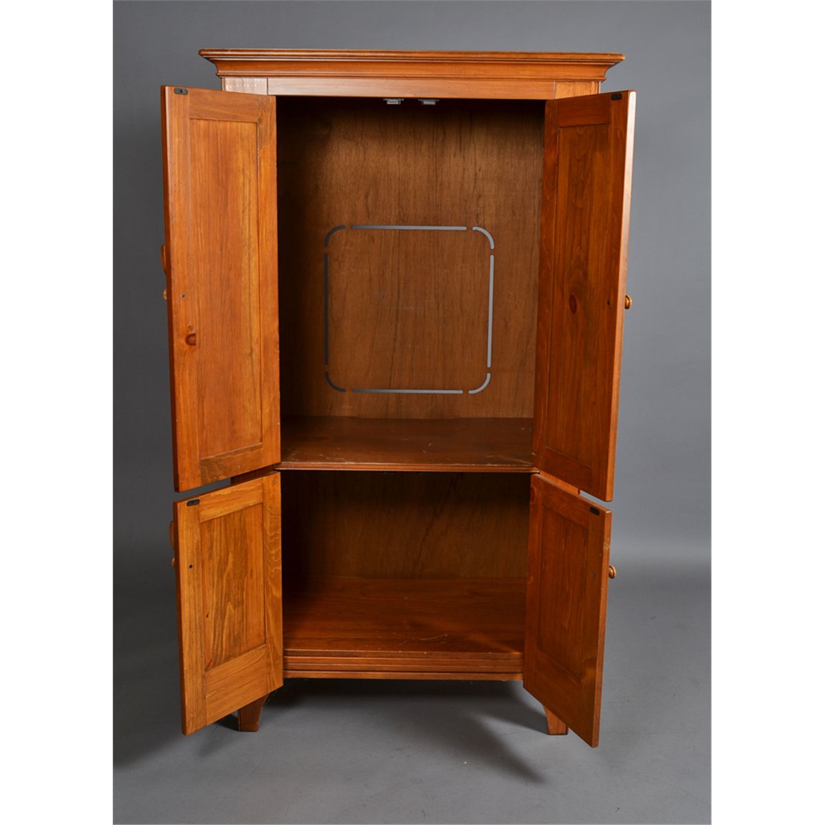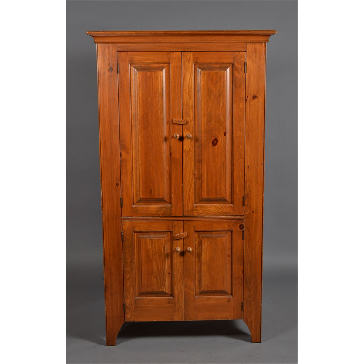 With two large over two small recessed doors, with wood knobs and primitive antique closures, the sides with recessed panels, the top with molded cornice. 64.75" H x 33" W. Circa 1950's. Pivate collection Lake Orion, MI.