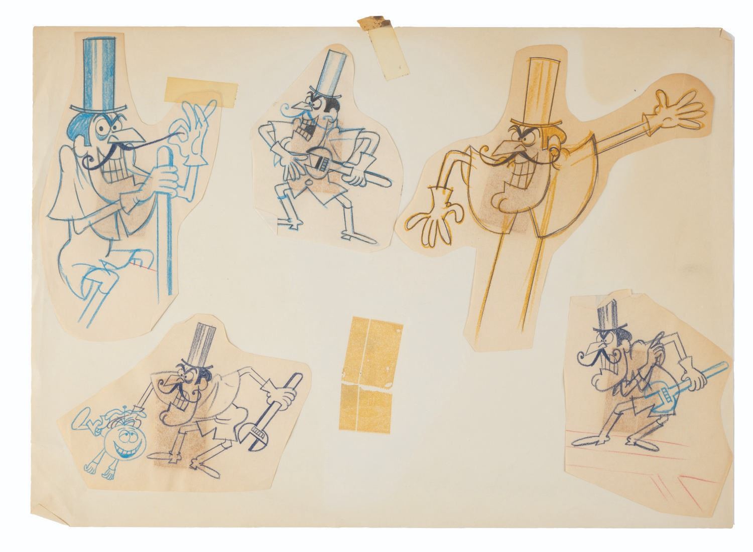 (Ward, 1960s-70s) An original hand-drawn model sheet featuring five sketches of Snidely Whiplash for his appearances in a series of Quisp Cereal commercials. Accomplished in graphite and colored pencil and adhered to paper measuring 10” x 14”, the drawing displays in good condition with loose drawings, edge tears up to 1.5”, discoloration from age, tape from production use, and folds, including a large fold at the bottom left corner.
