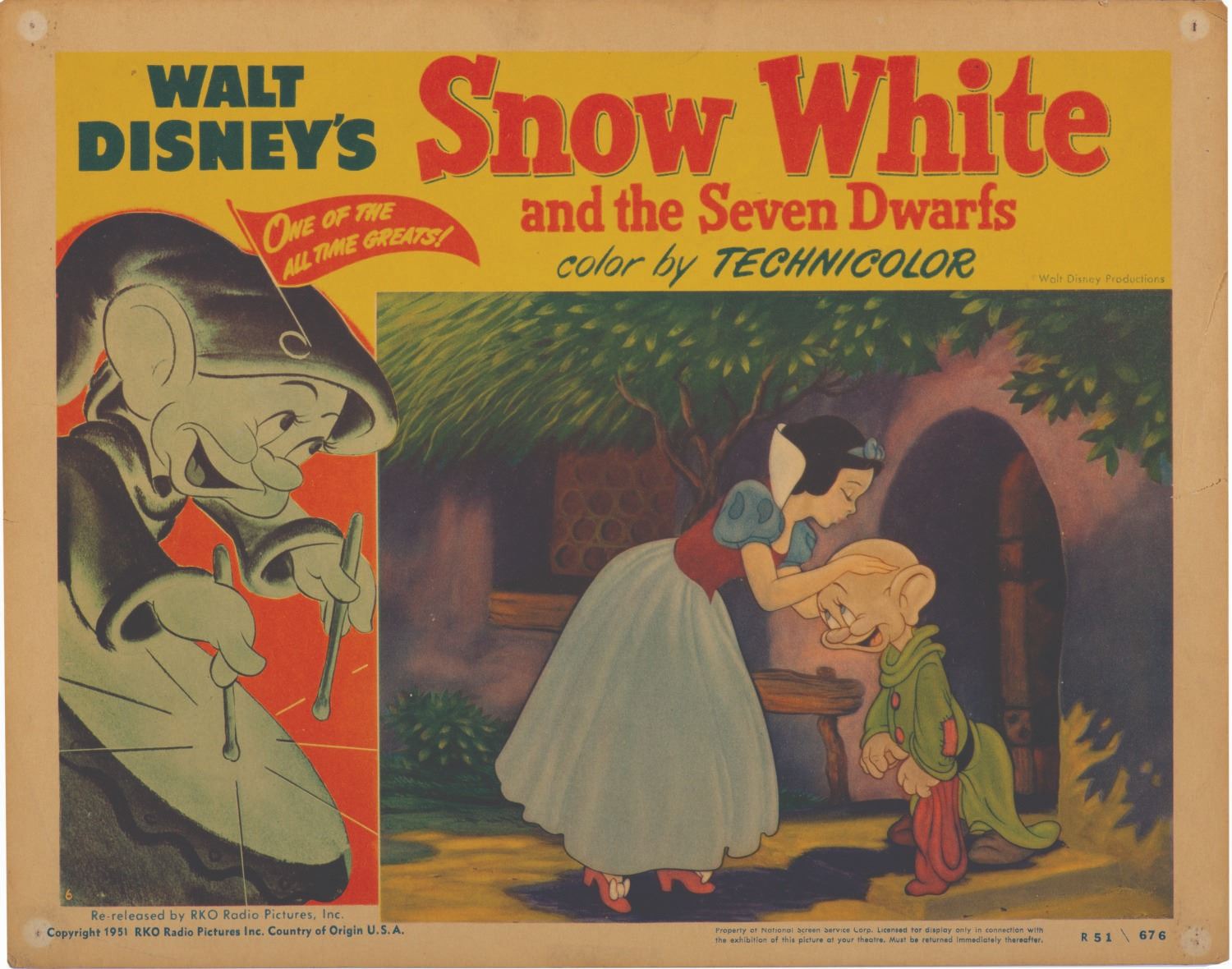 (Disney, 1951) A 1951 re-release lobby card for Walt Disney's “Snow White and the Seven Dwarfs”. Measuring 11"x14", the card displays in good condition with pin holes and very small tears at the corners, and discoloration from age.
