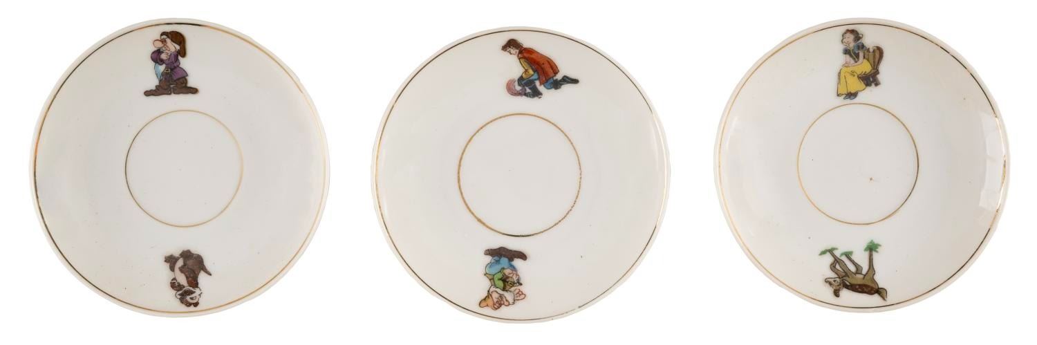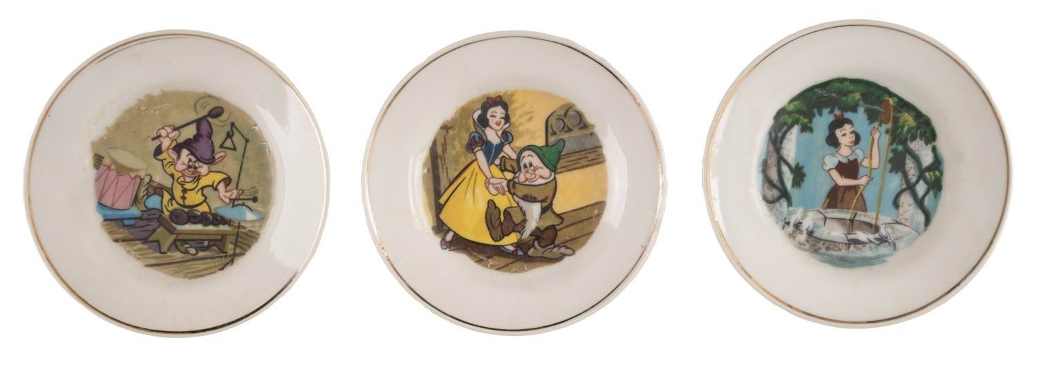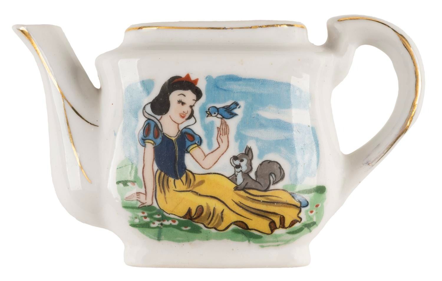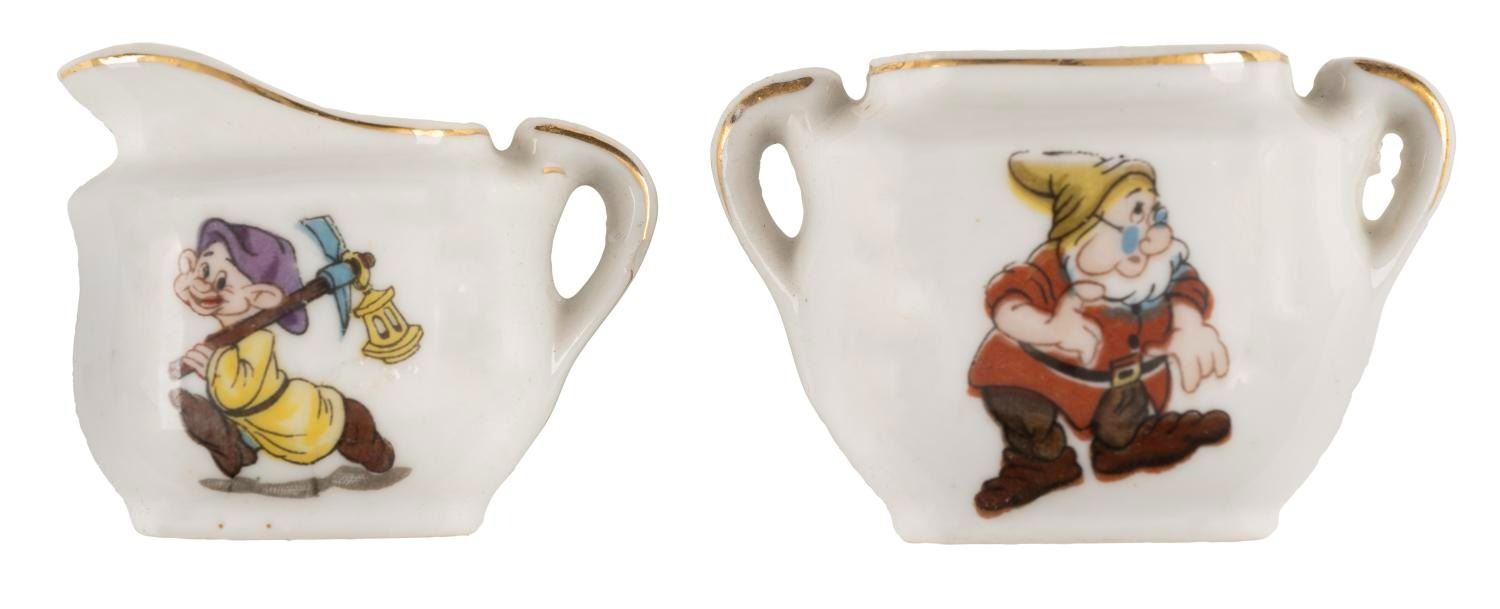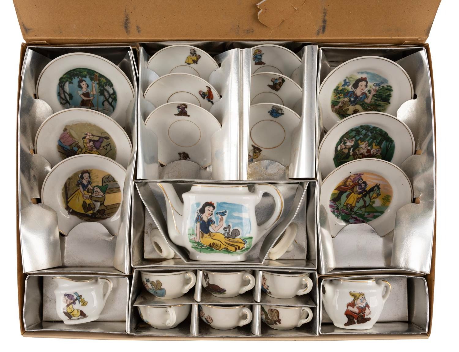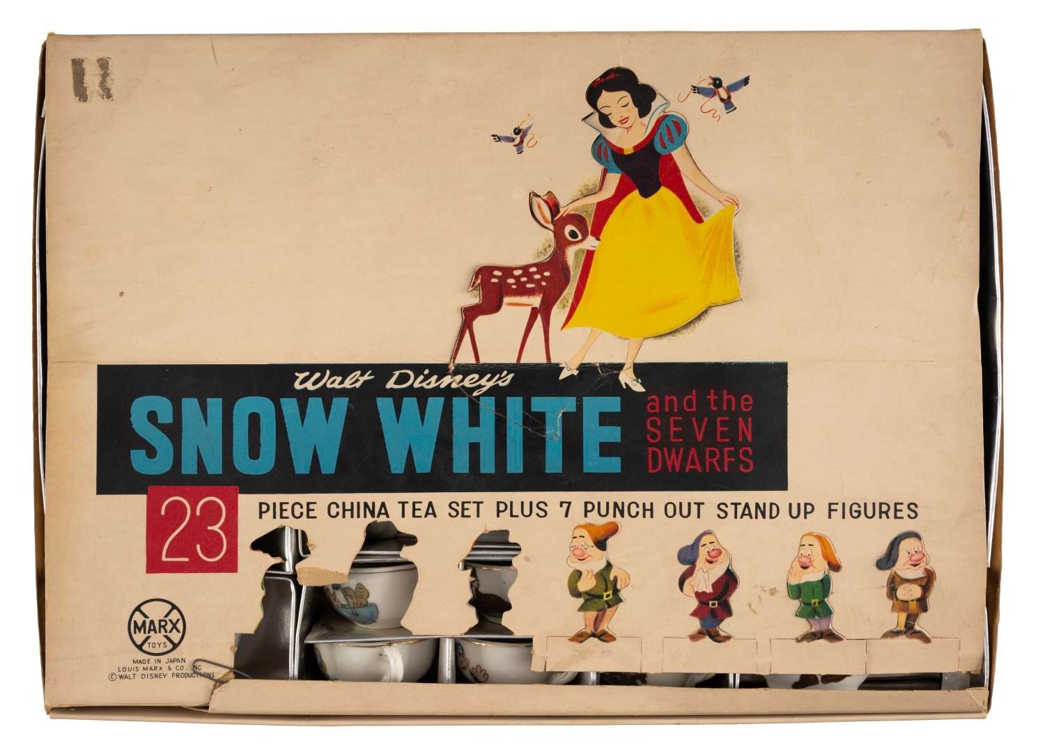 (MARX, 1950s) A "Snow White and the Seven Dwarfs" 23-piece china tea set and punch-out figures with its original box. The dishes measure various sizes and are in very good condition with minor wear. The 15.75"x11.5"x2.75" box is in good condition exhibiting creases, tears, markings, wear to the box, and is missing three punched figures.