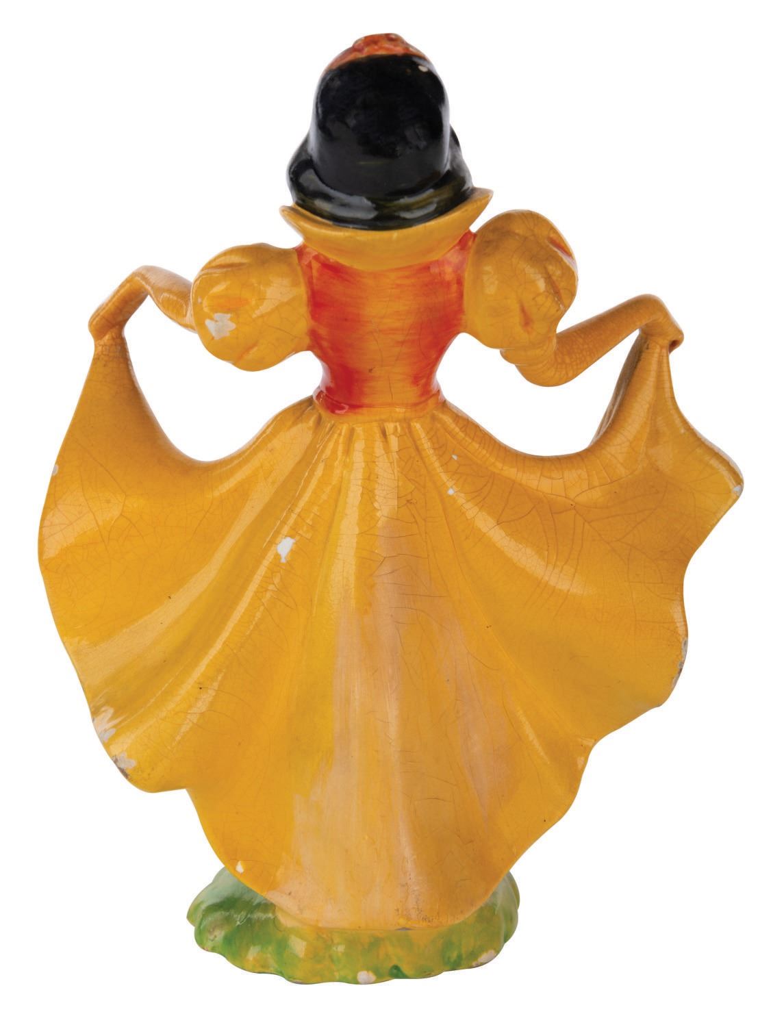 (Wade, 1938) A Snow White painted glazed ceramic figurine by Wade of England. Measuring 5"x6.5" tall, the figurine is in good condition with mild fading to color, slight chips and wear to painted areas, and light crazing throughout.