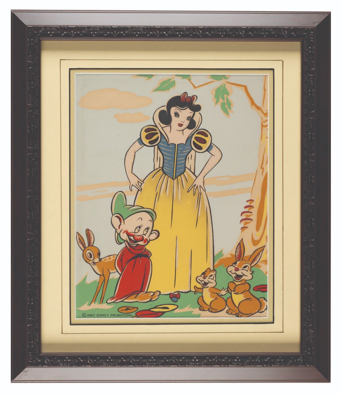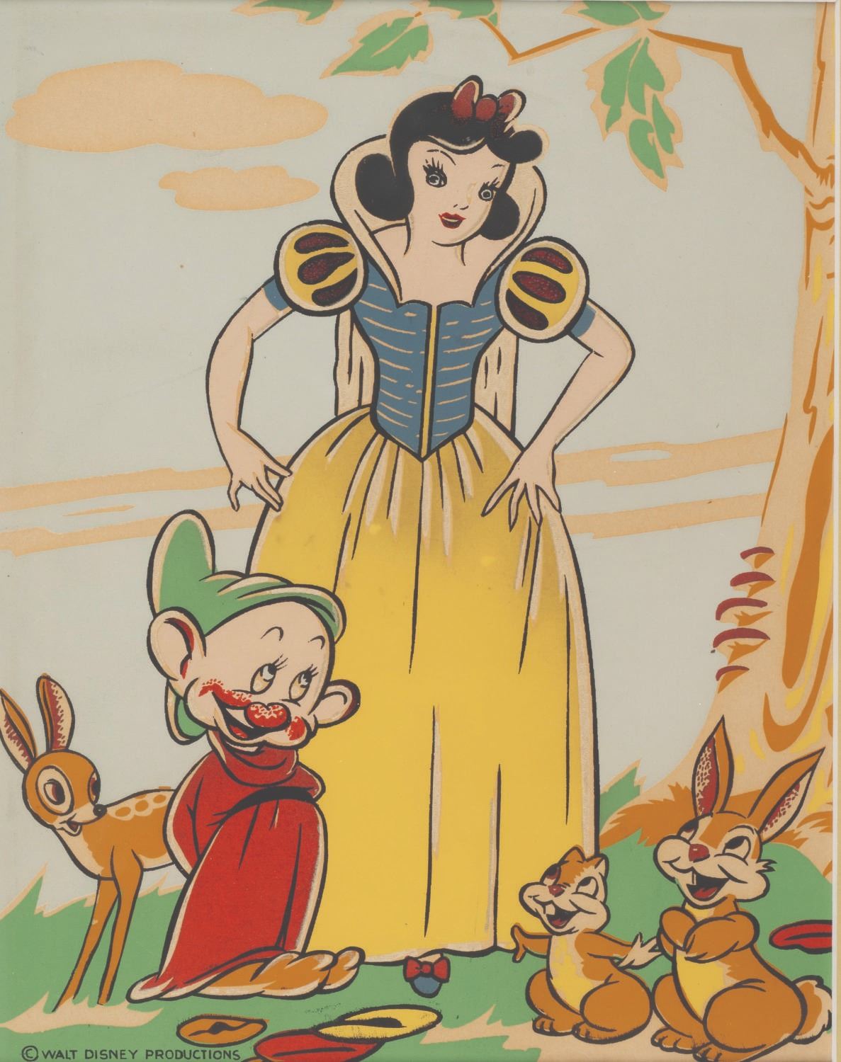 (Disney, 1940s) A silkscreened print of Snow White and Dopey from "Snow White and the Seven Dwarfs." Measuring 12" x 14" in the frame, the piece is in very good condition with light wear from age.