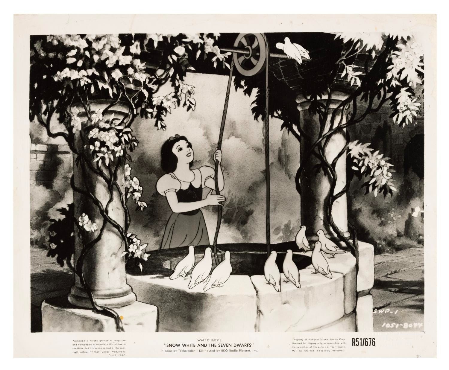 (Disney, 1952) A “Snow White and the Seven Dwarfs” black and white promotional photo from the film’s 1952 re-release. Measuring 8.25” x 10”, the photo displays in fair condition with heavy scratches, spotting, creases, pinholes, a stamp at the bottom right corner, and edge wear, particularly at the top right corner.