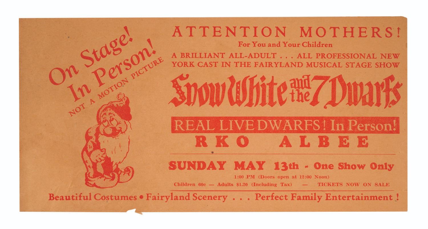 (RKO, 1940s-50s) An advertisement for the Snow White and the Seven Dwarfs Stage Show at an RKO-Albee Theater. Walt Disney’s Snow White and the Seven Dwarfs was scheduled to play every vaudeville theater of the RKO-Albee circuit, and this singular promotional stage show was likely created to draw larger-than-usual audiences into the theater on Sunday, May 13th. This advertisement notably mentions "real live dwarfs" among the "all-adult… all professional New York cast." Measuring 8.5" x 4.25", the ad is in good condition with a few small tears and edge wear.
