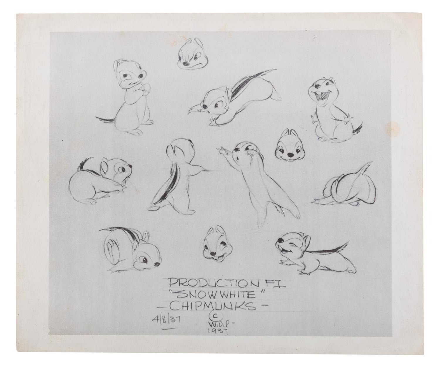 (Disney, 1937) A photostat model sheet of a chipmunk from “Snow White and the Seven Dwarfs.” Model sheets such as this were distributed to animators and crew working on the film to ensure character design continuity. Measuring 10” x 12”, the model sheet is in good, production-used condition with light wear overall, including small creases, light stains, and light discoloration from age.