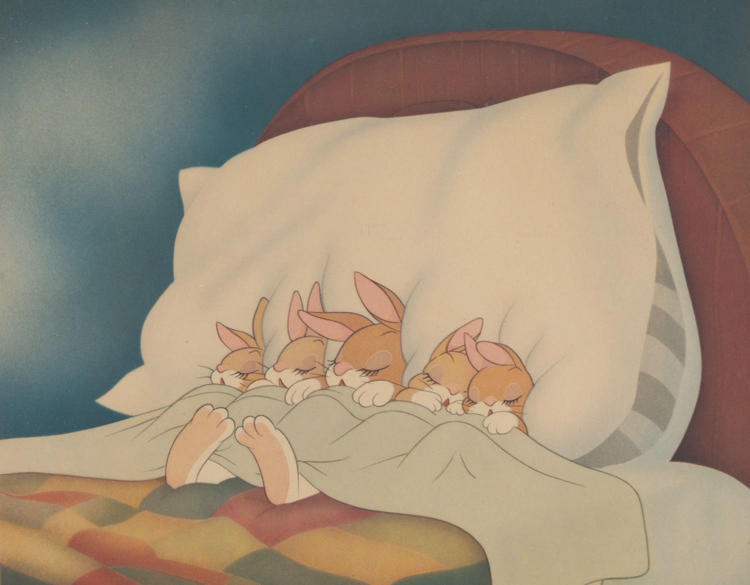 (Disney, 1950s-60s) A Disney Studio photographic dye transfer of a scene from "Snow White and the Seven Dwarfs,” titled "Tired Bunnies.” Dye transfer prints like this were given to visitors of the Studio, and later sold in the Art Corner at Disneyland. With a visible image size of 10” x 12” in an 11” x 12.2” frame, the print is in very good condition with some color fading from age, and scuffs and chips to the molding of the frame. From the estate of Bob Clampett.