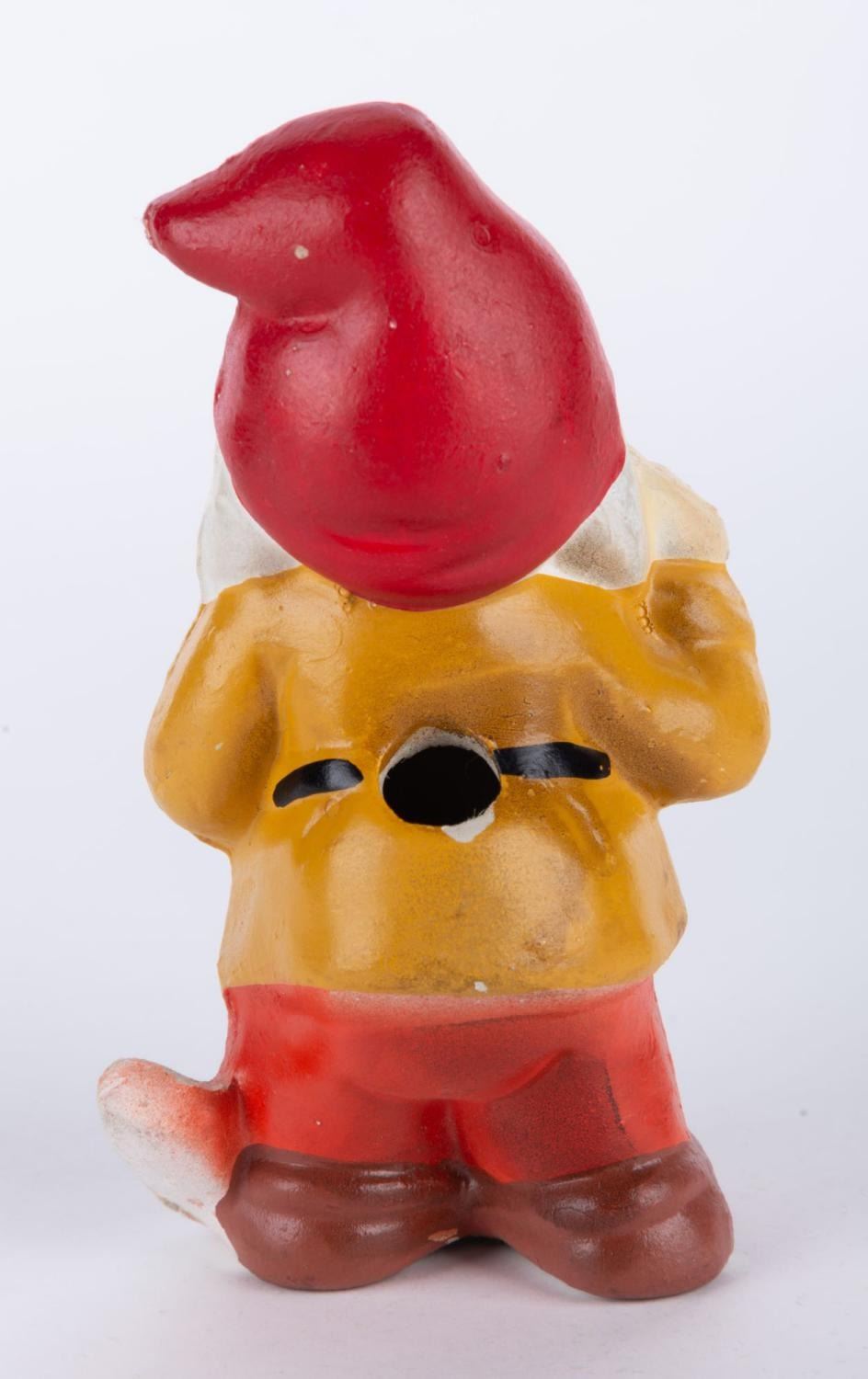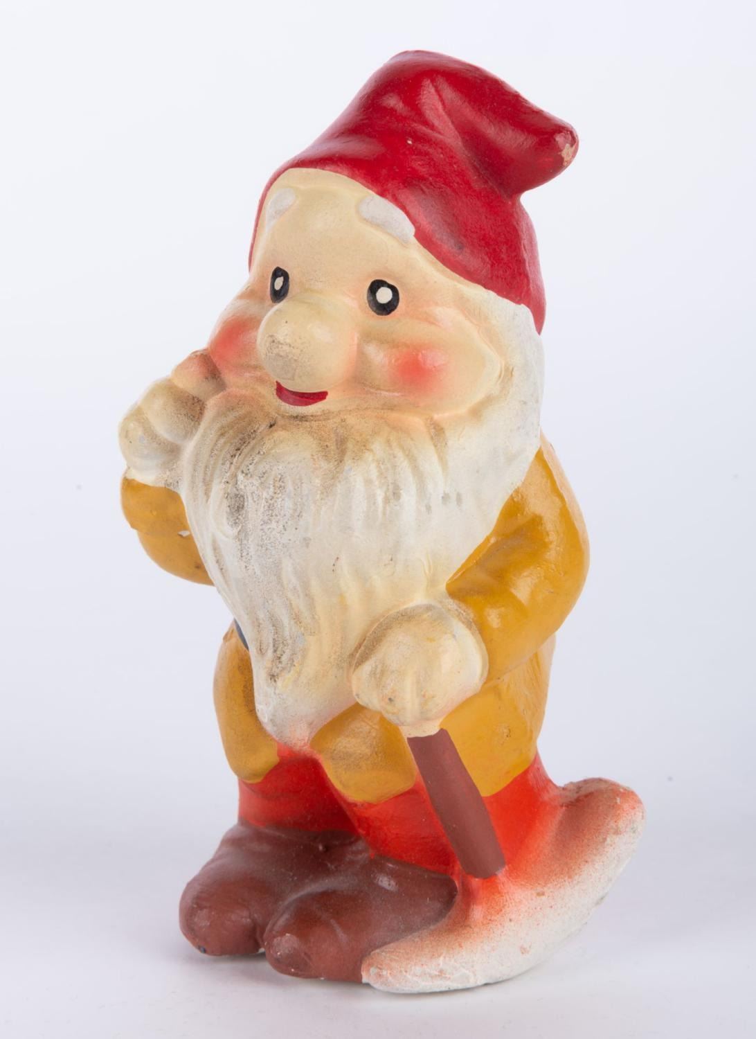 (Disney, 1950s-60s) A ceramic figurine of Happy from "Snow White and the Seven Dwarfs." The figurine measures 2.75" x 2" and 4" tall, and is in good condition with rough areas of paint and minor discoloration.